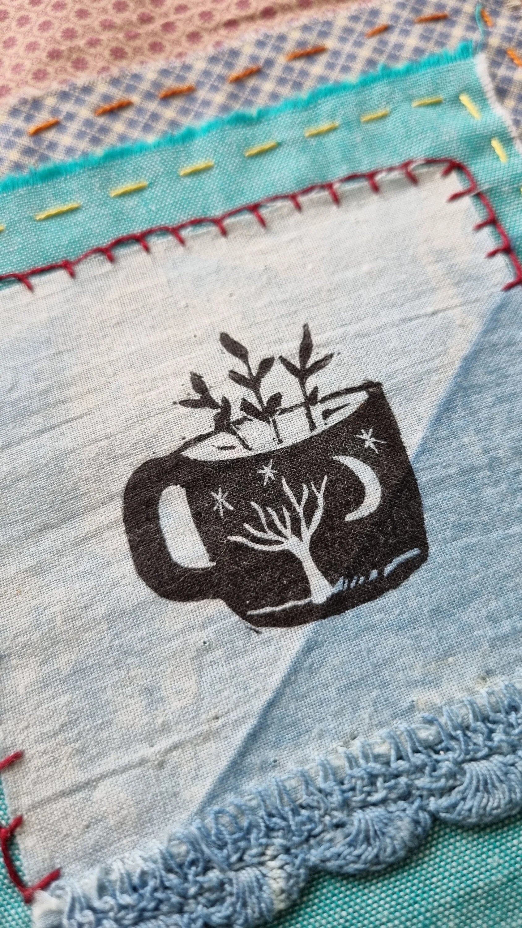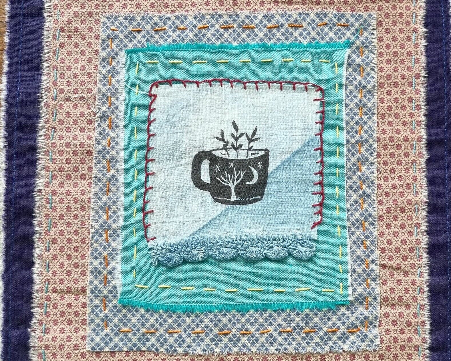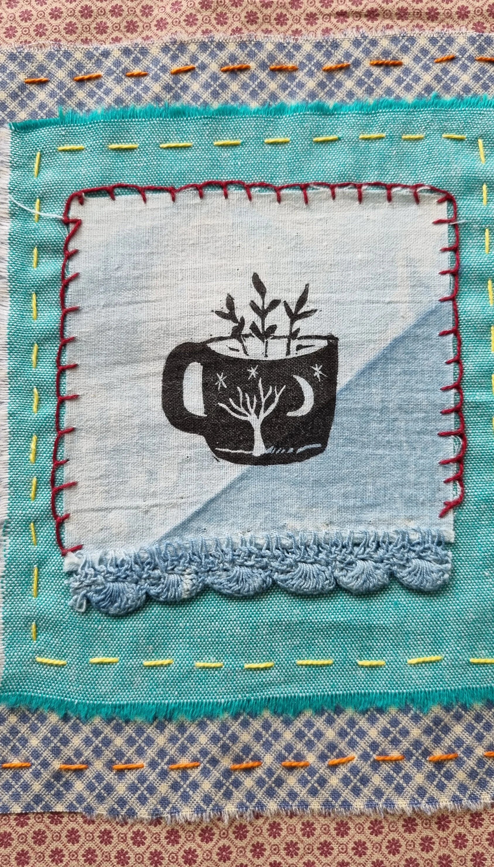 Contained magic.....a patchwork textile, 22cm X 30cm in size....it is made with one of my original lino cuts printed onto cotton....I used many vintage cloth with running and blanket stitch with a rough frayed edge....this piece is ready to be framed or you can pin to wall...or you can add this to your own patchwork quilt project. This will be sent in a protective sleeve in a rigid mailer via Australia post.