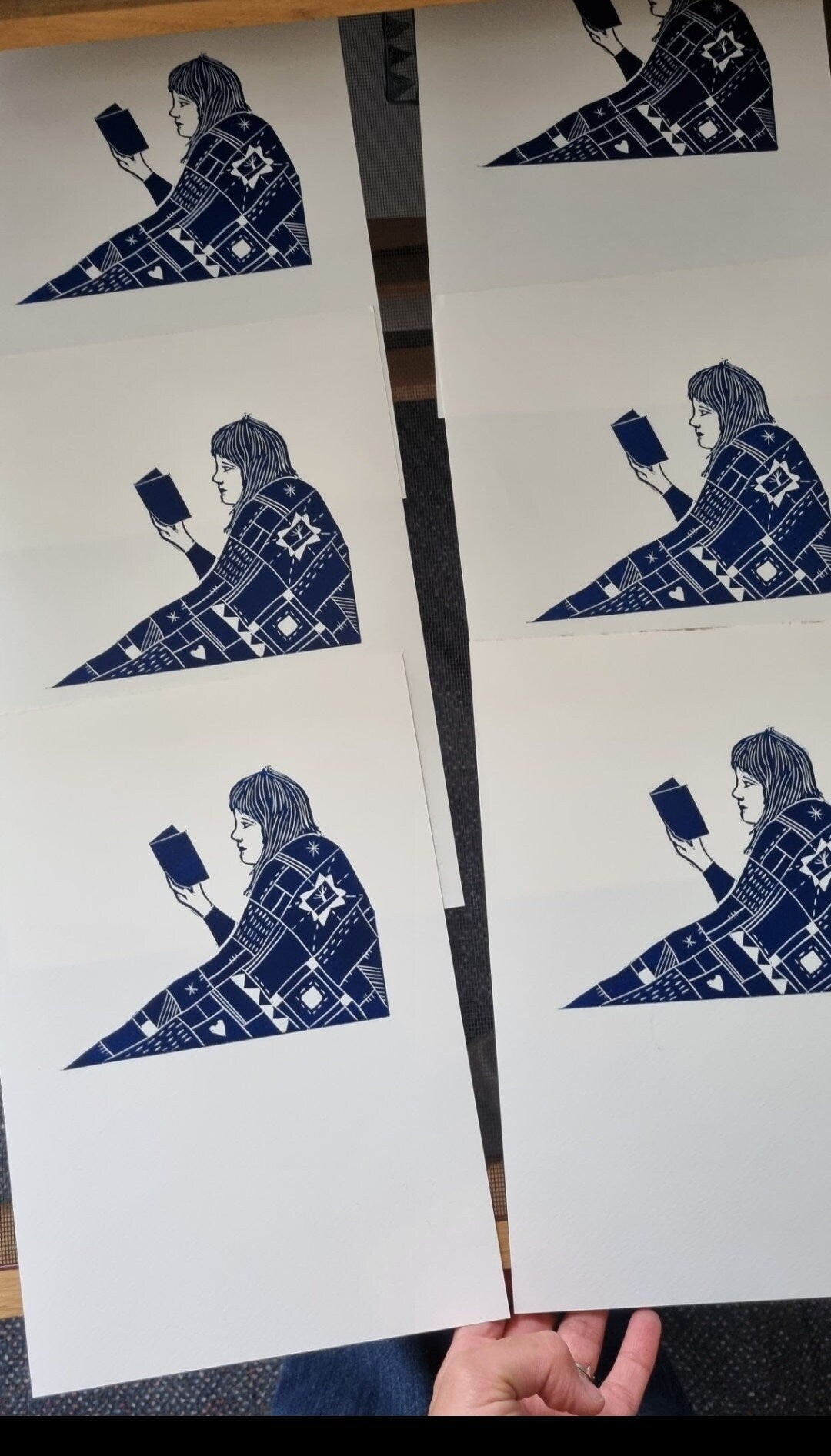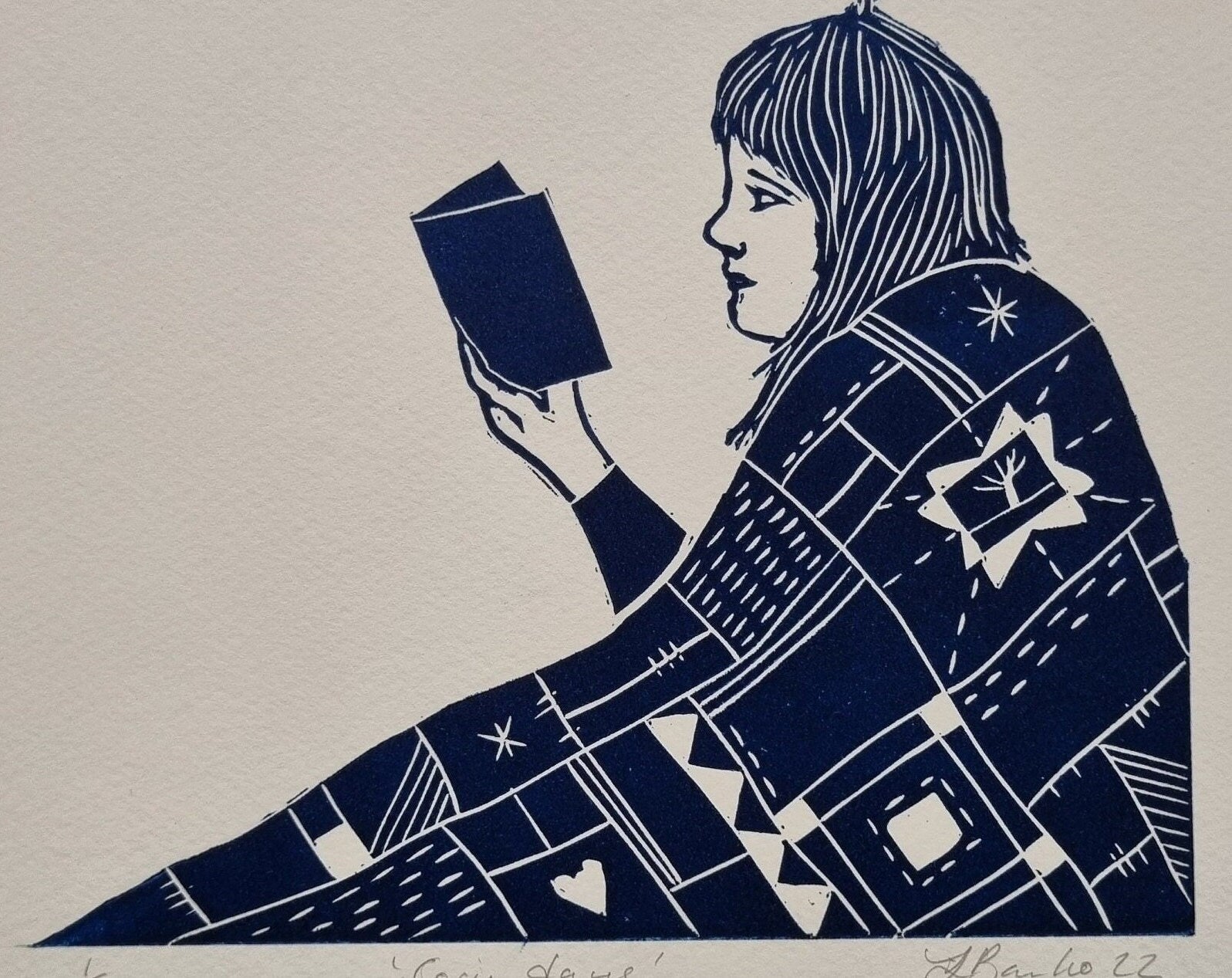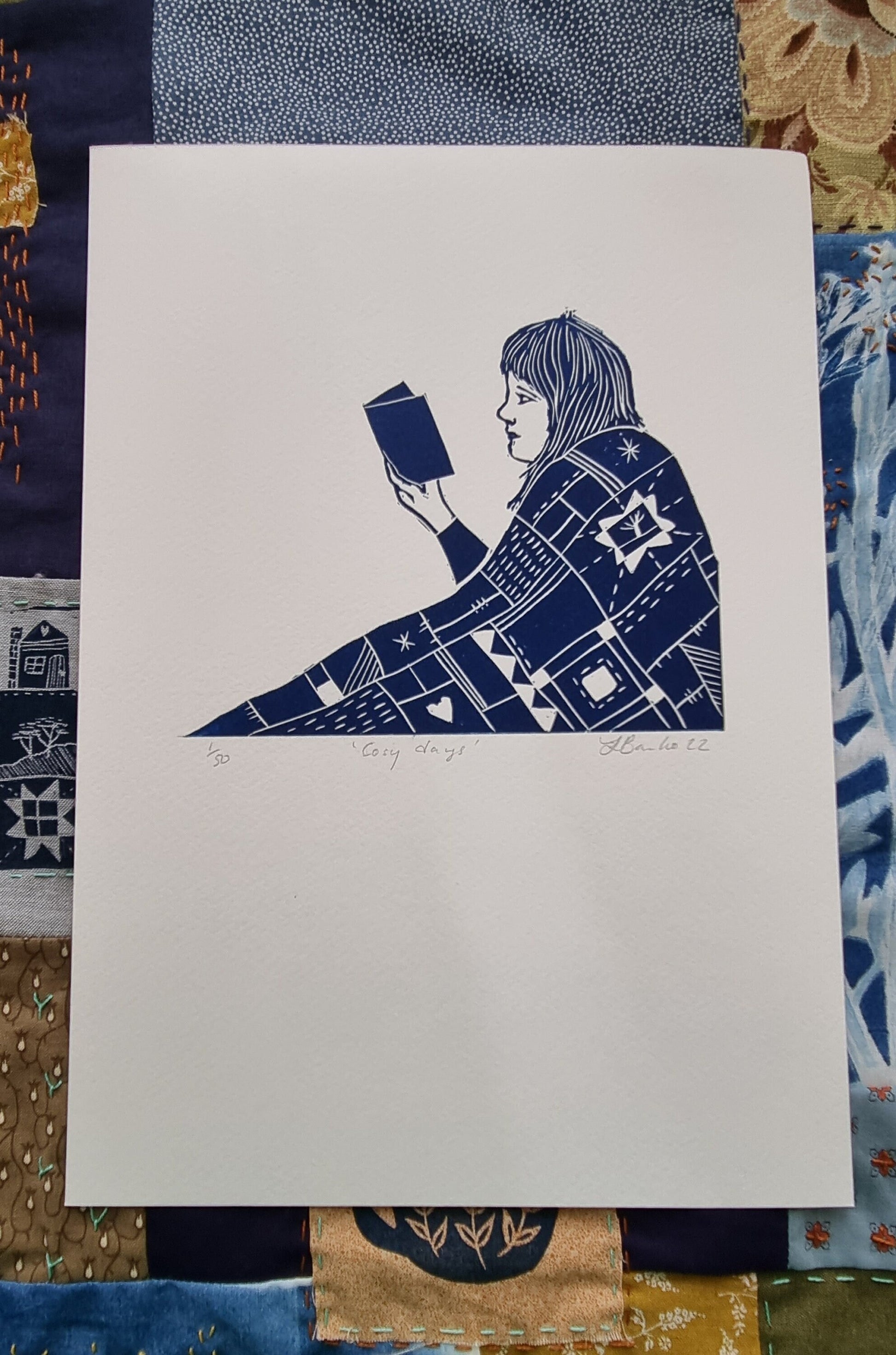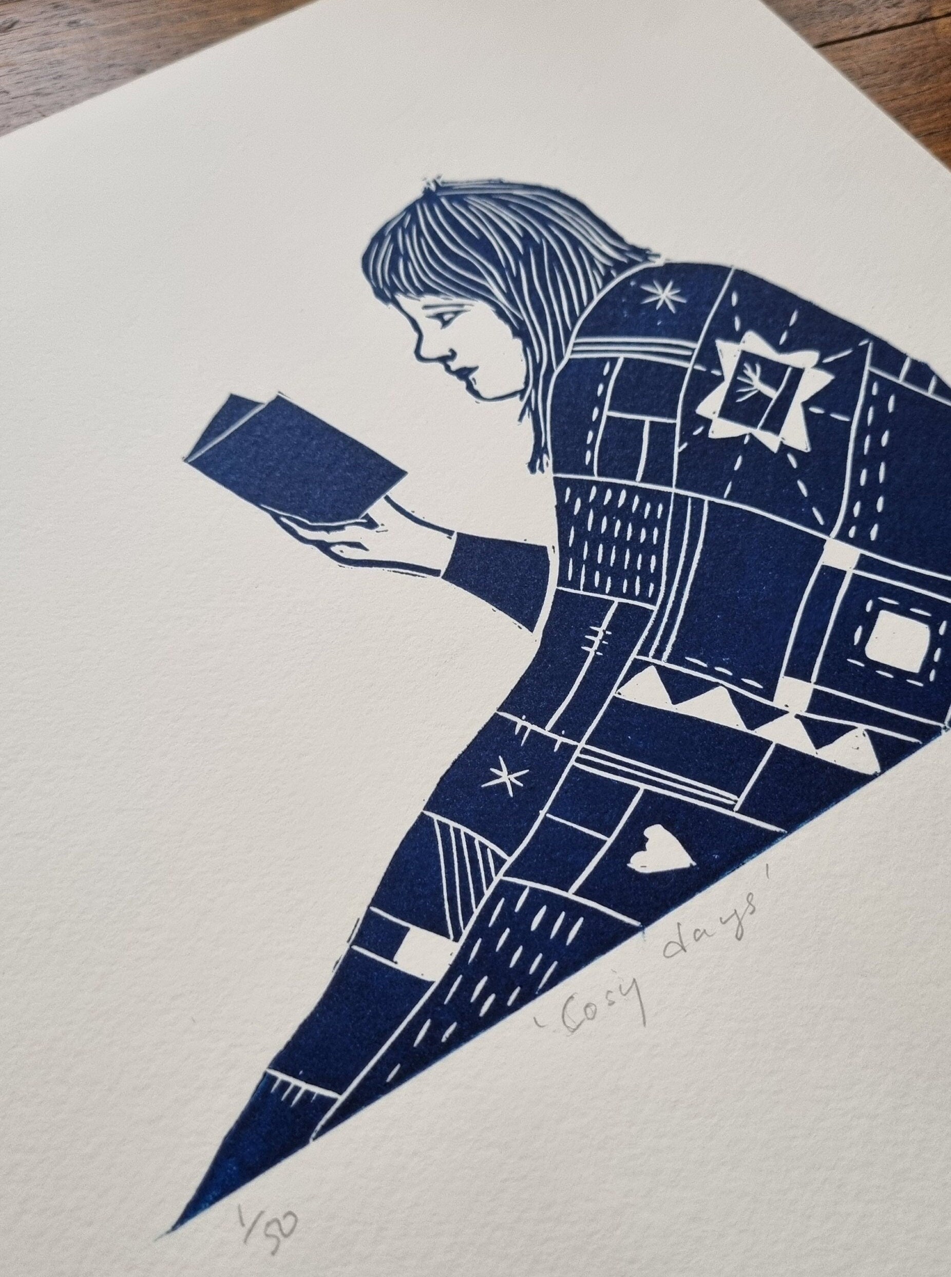 An original hand carved lino cut inspired by winter days snuggling up with a great book and quilted blanket... it is hand printed using dark blue oil based ink through my etching press onto A4 180gm water color paper and is an edition of only 50 prints available. Signed, dated and unframed. This is sent in a protective sleeve in a rigid mailer.