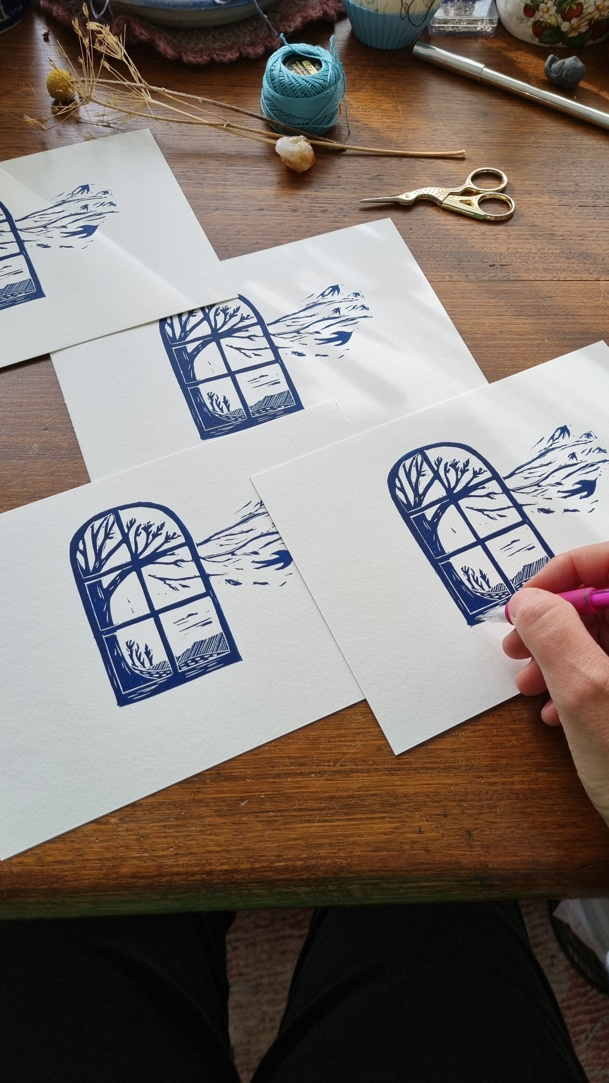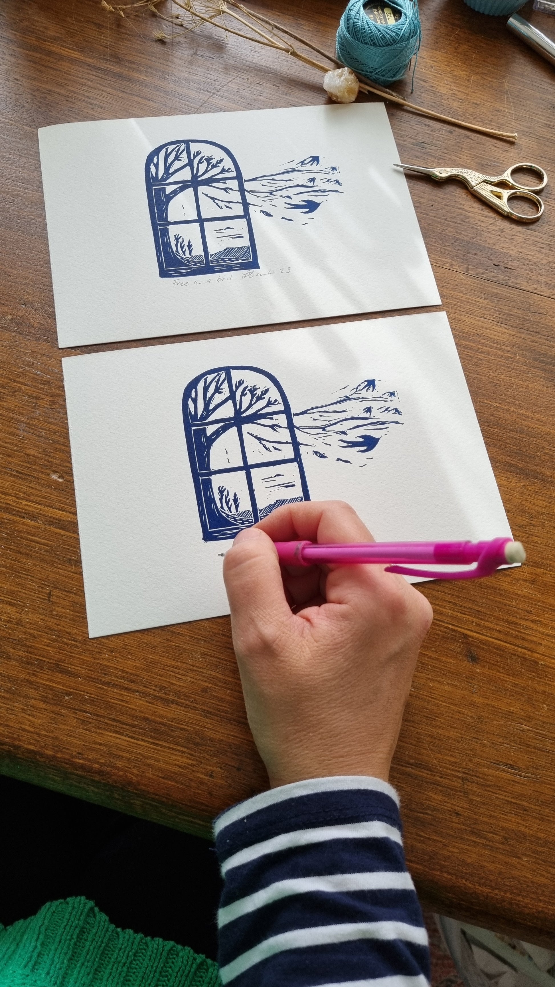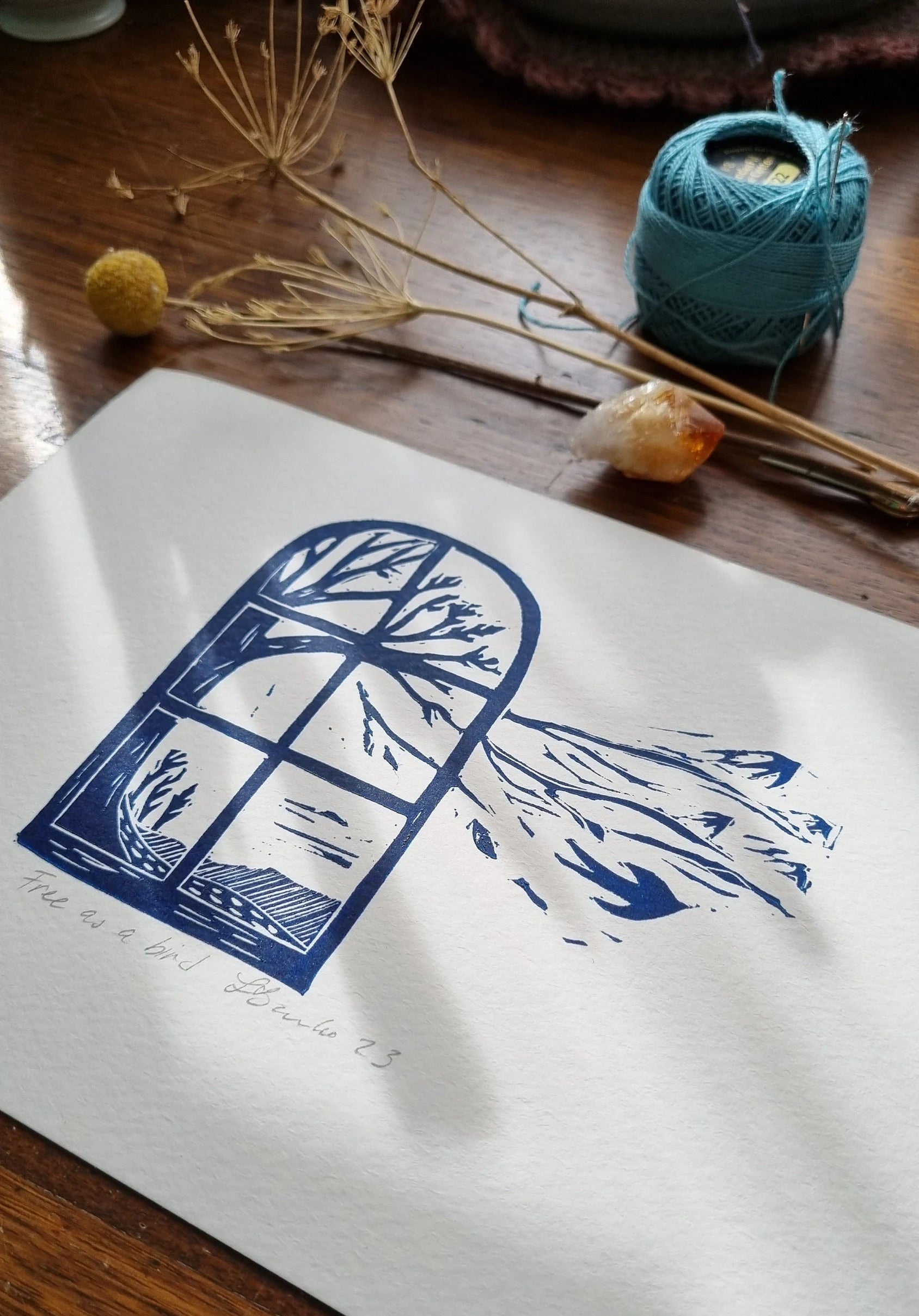 Free as a bird is an original hand carved lino cut....printed in my home studio on my etching press. Inspired by my love of Windows and the idea of letting things go with the wind. Its printed in Blue oil based ink on A5 300gm water colour paper unframed. This is an open edition that is signed and dated. This will be sent in a protective sleeve in a rigid mailer via Australia post.