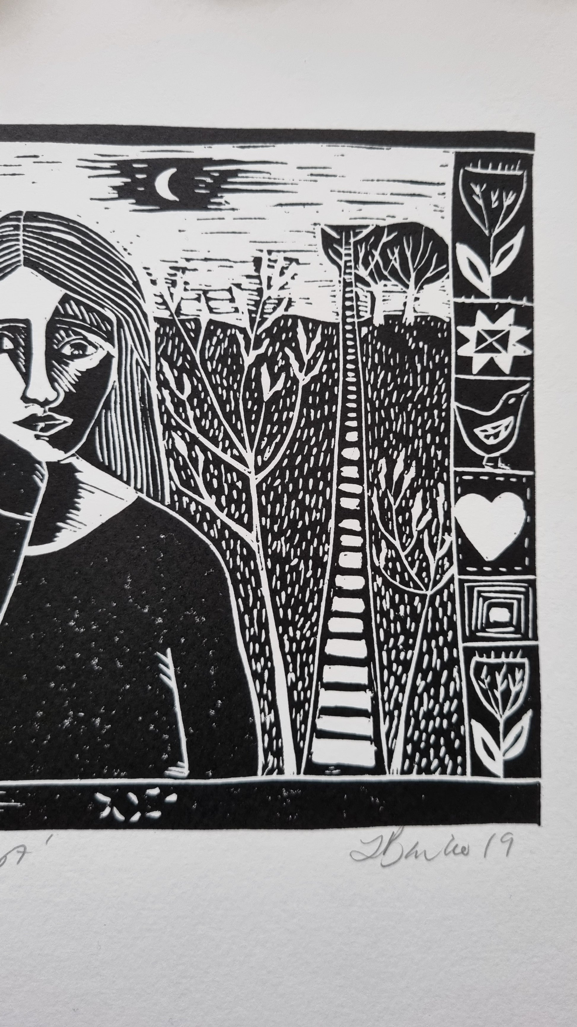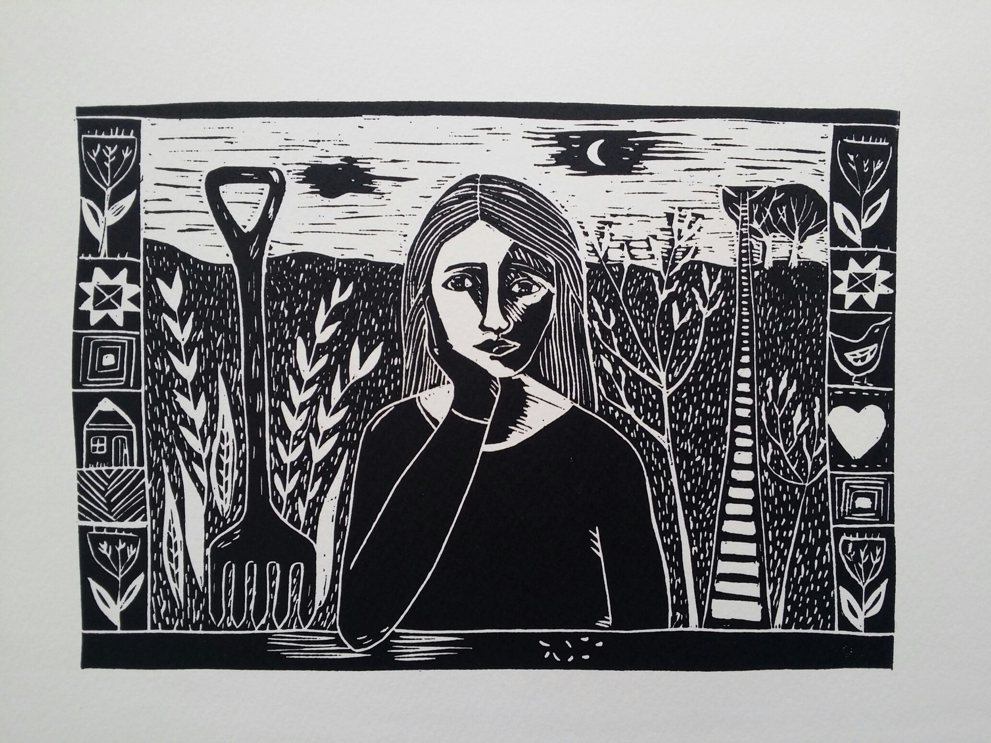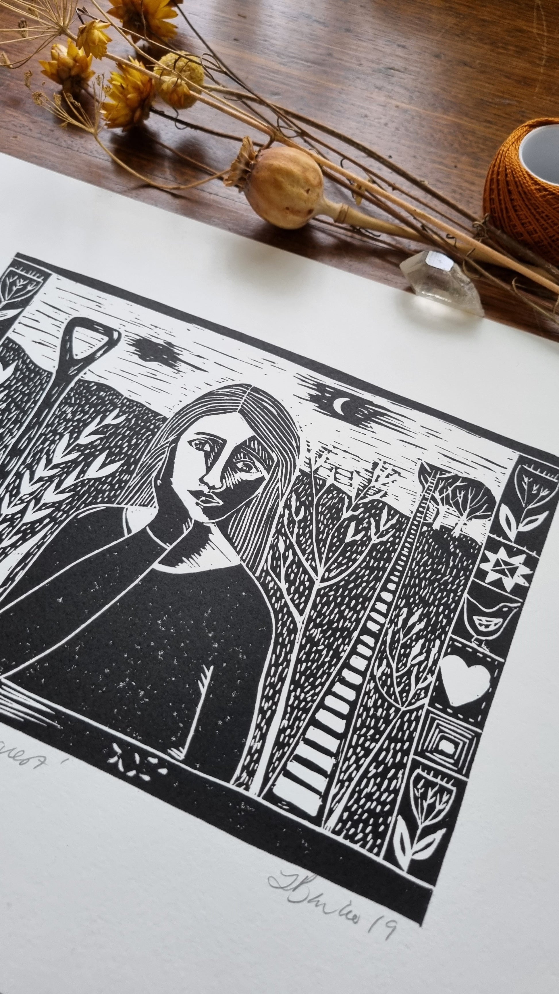 Harvest.....is a limited edition of only 50 hand cut lino prints....black oil based ink on A4 180gm water colour paper unframed signed and dated....this original work on paper is inspired by the cycles of nature and the connection that it has to our own life cycles....life, death, growth, planting seeds (ideas/dreams).... this will be sent in a protective sleeve in a rigid mailer via Australia post.