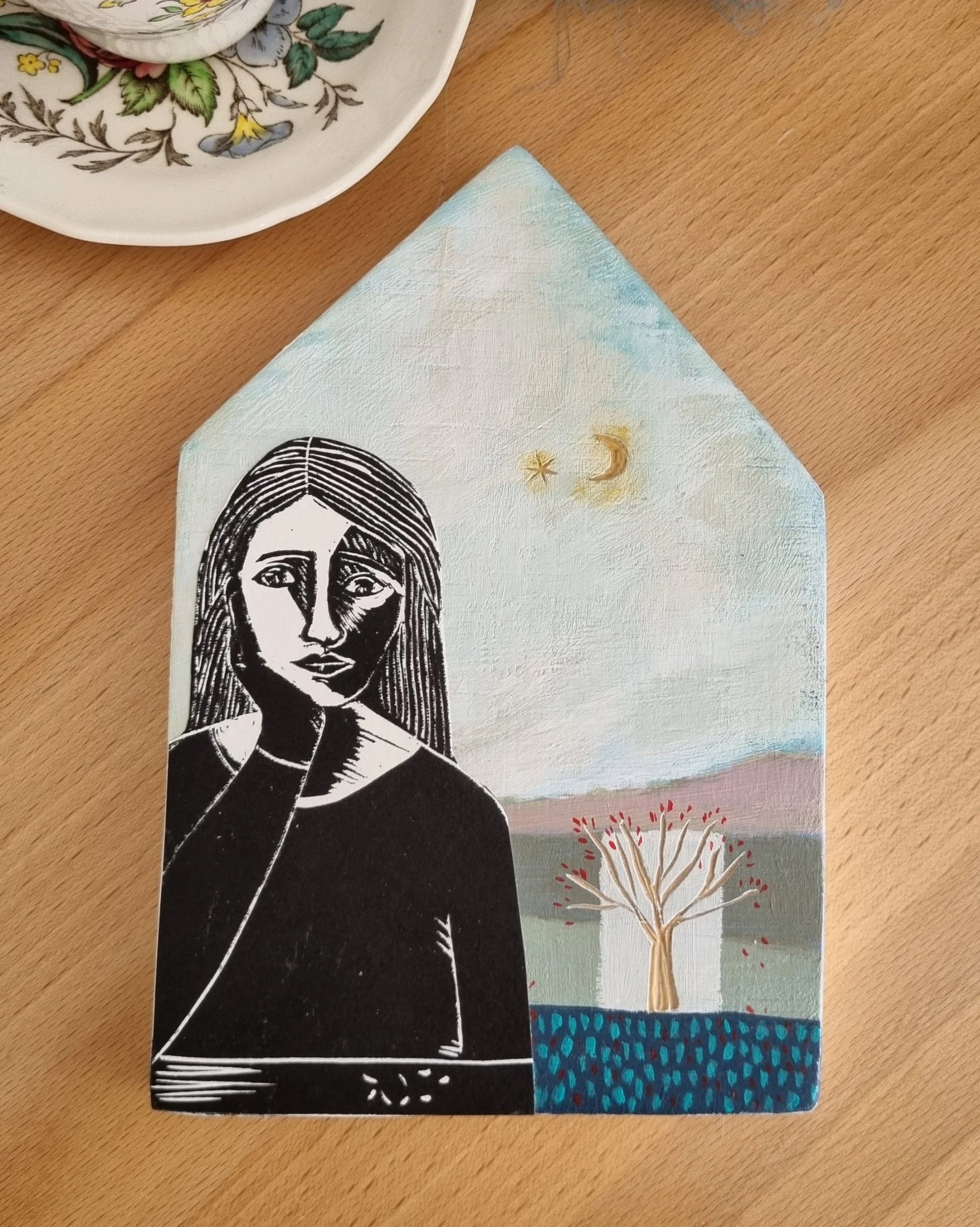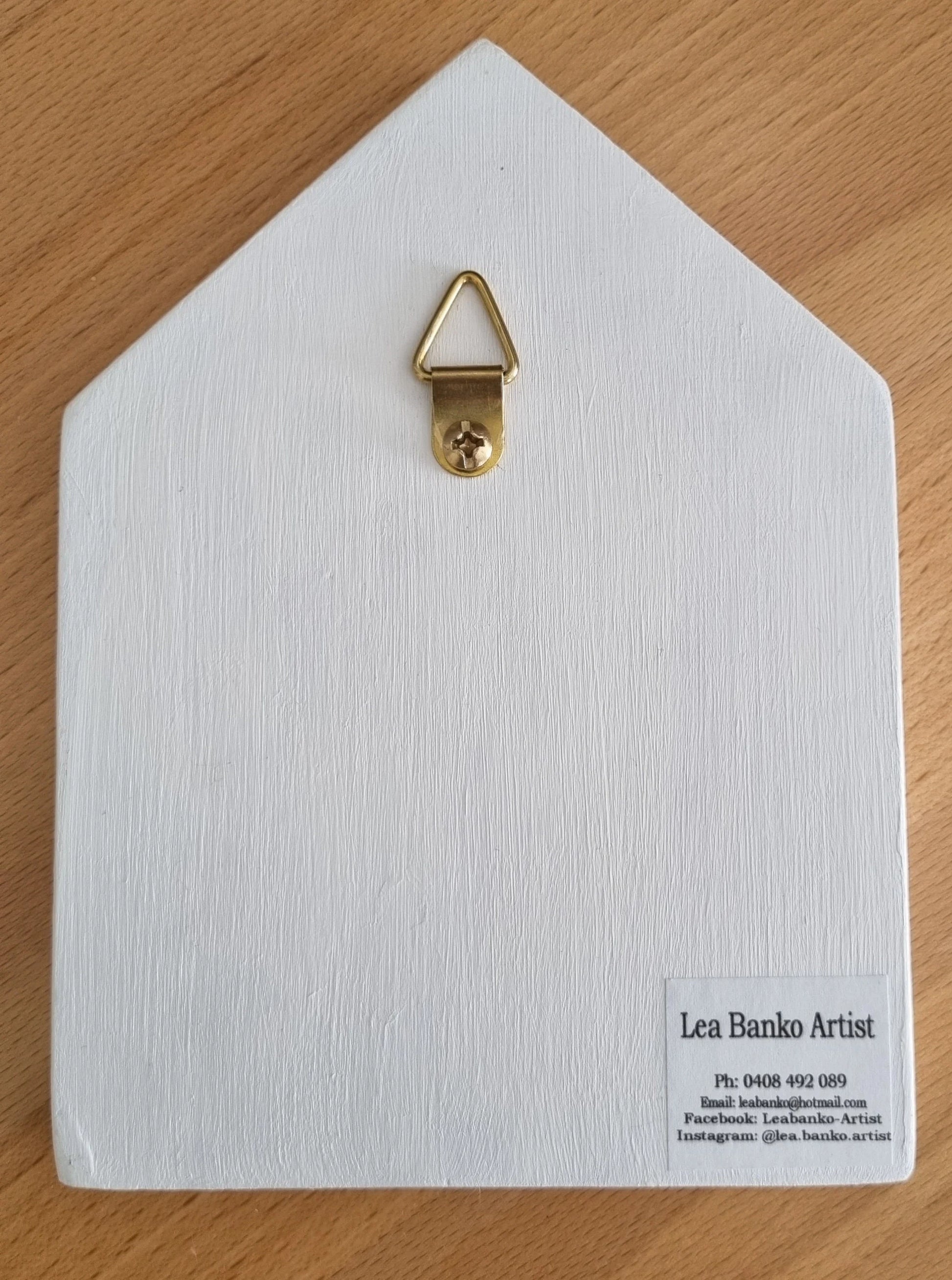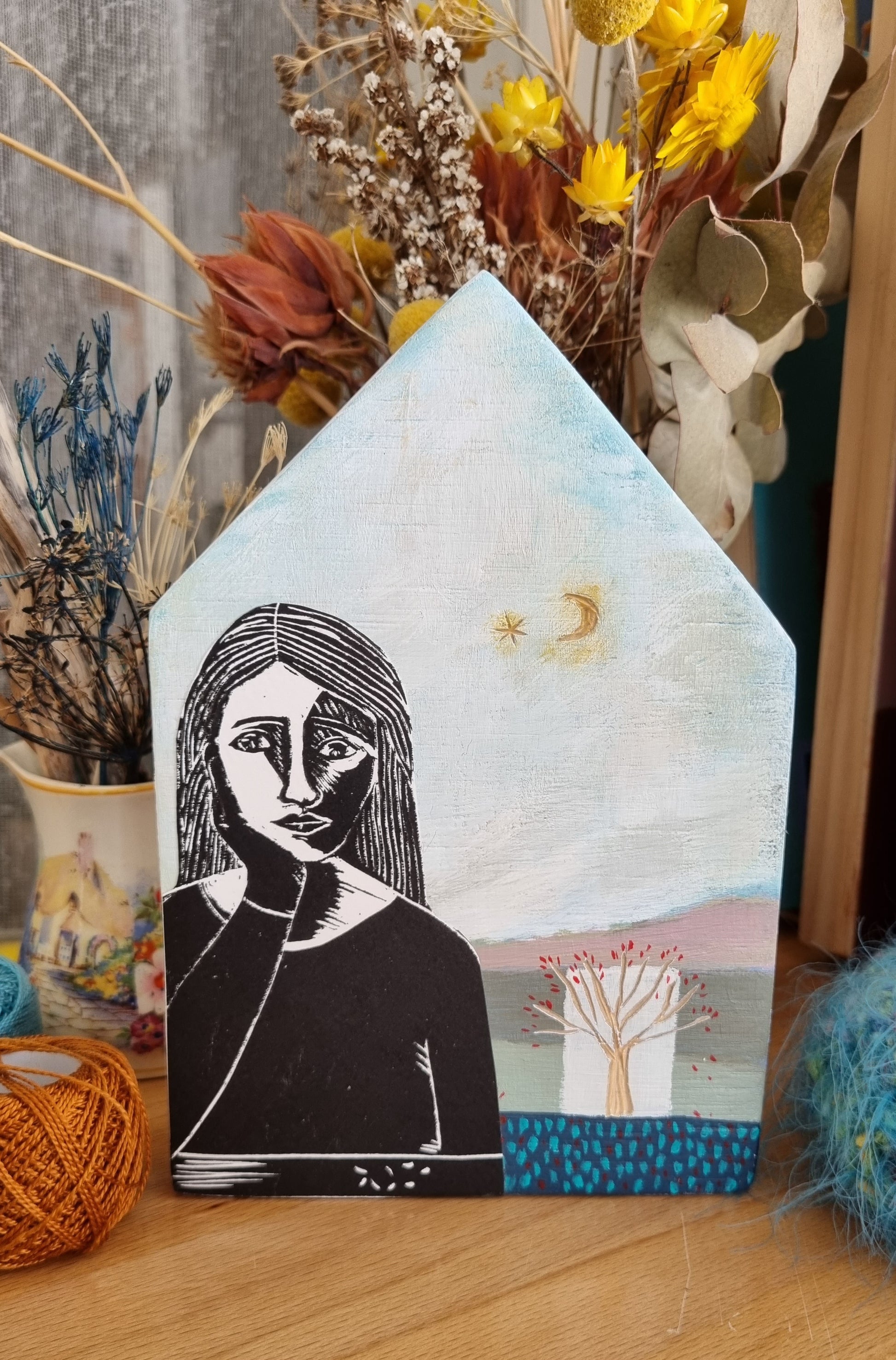 I'll tell the moon....is a mixed media original artwork on reclaimed timber. A labour of love....timber is cut, sanded and primed by hand. Then the fun part is letting the image and colours emerge within the house shape. Size 11cm X 16.5cm. I use acrylic paint, my original lino cuts collaged and carving directly into the timber to create this one of its kind art. You can have it sit upright like a sculpture or there is an option to hang on the wall with the d-ring that is on the back. This will be sent bubble wrapped in a padded bag via Australia post.