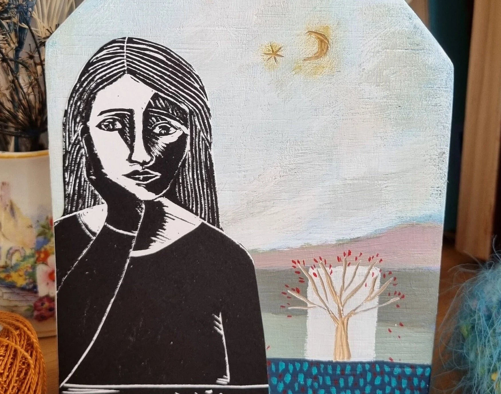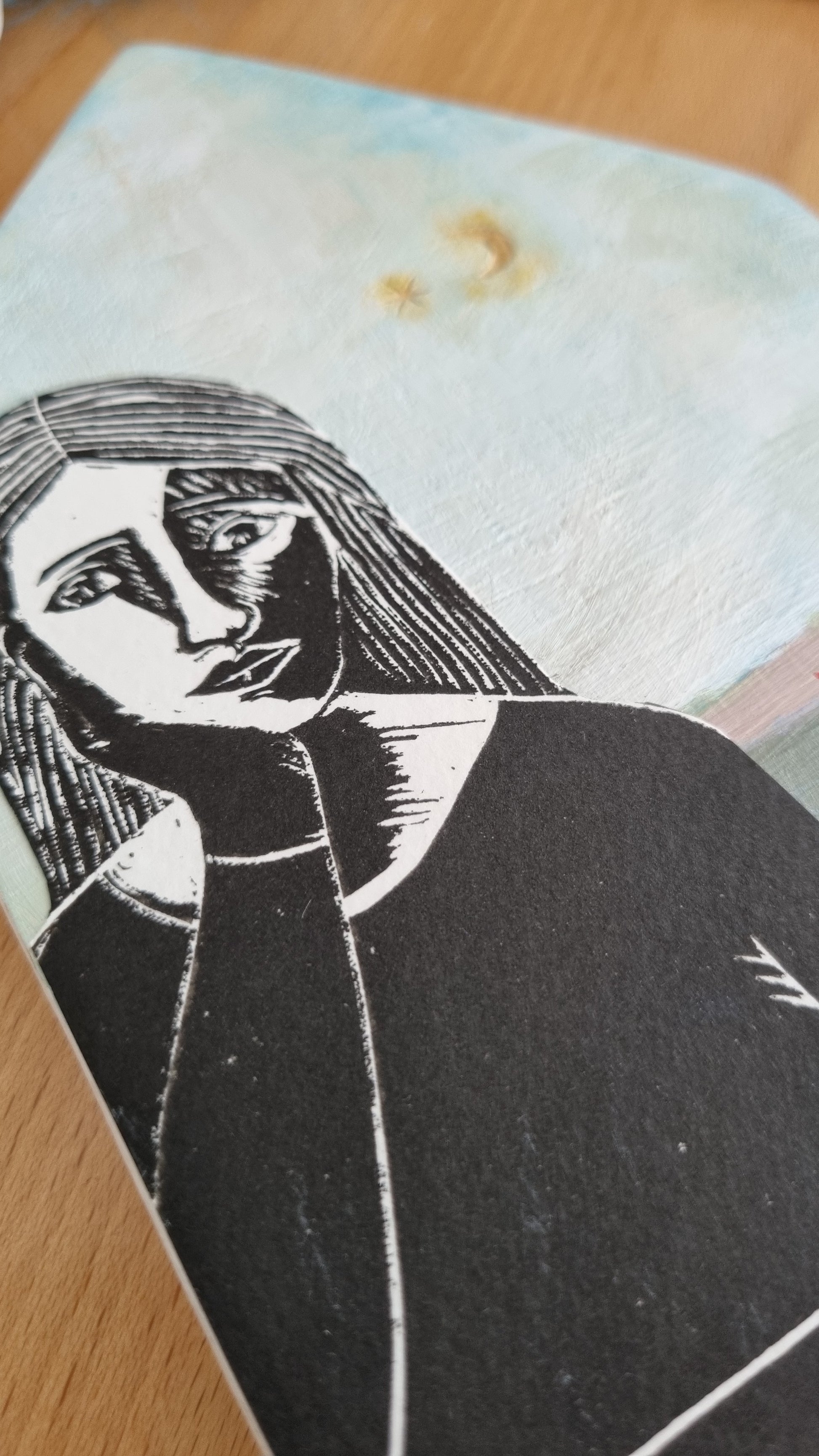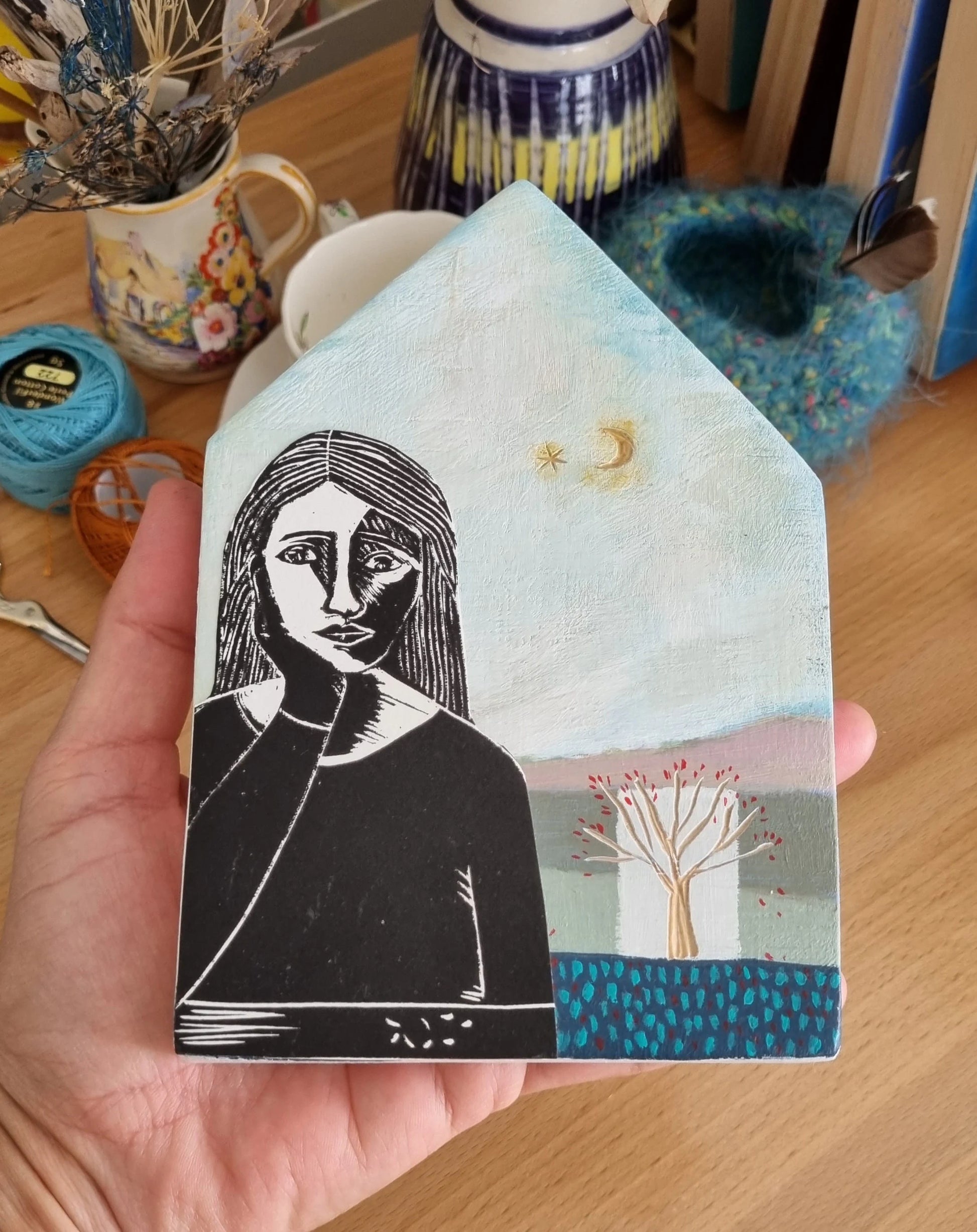 I'll tell the moon....is a mixed media original artwork on reclaimed timber. A labour of love....timber is cut, sanded and primed by hand. Then the fun part is letting the image and colours emerge within the house shape. Size 11cm X 16.5cm. I use acrylic paint, my original lino cuts collaged and carving directly into the timber to create this one of its kind art. You can have it sit upright like a sculpture or there is an option to hang on the wall with the d-ring that is on the back. This will be sent bubble wrapped in a padded bag via Australia post.