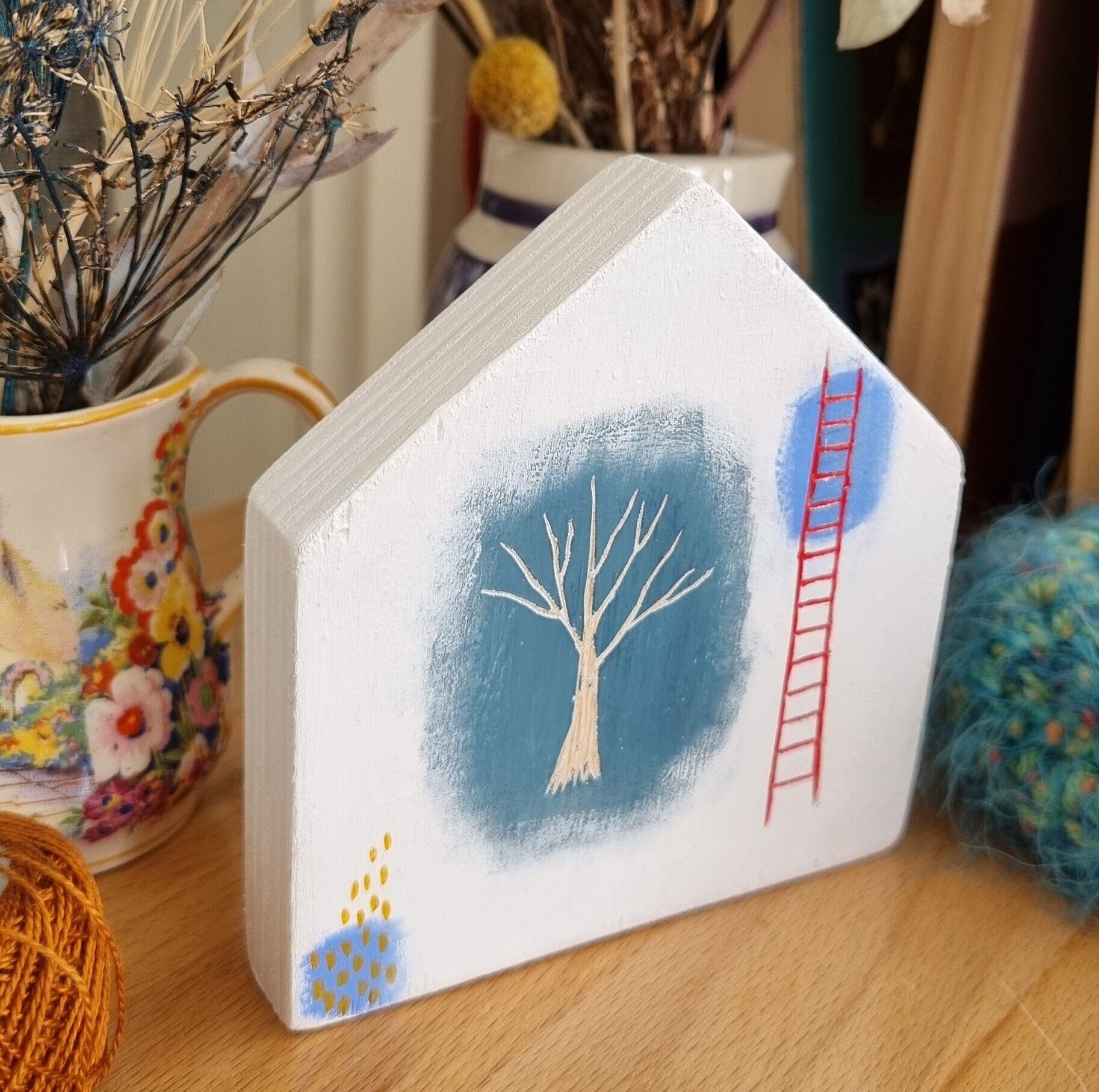 Little red ladder.....this is an original painting on timber.....this is a labour of love, each house is made with reclaimed timber, cut and hand sanded. I use acrylic paints and hand carved details like the tree and ladder for a 3D quality. This art piece is 10cm X 10.5cm. This can be hung with the d-ring on the back or standing up right as a sculpture. This will be bubble wrapped and sent in a padded bag via Australia post