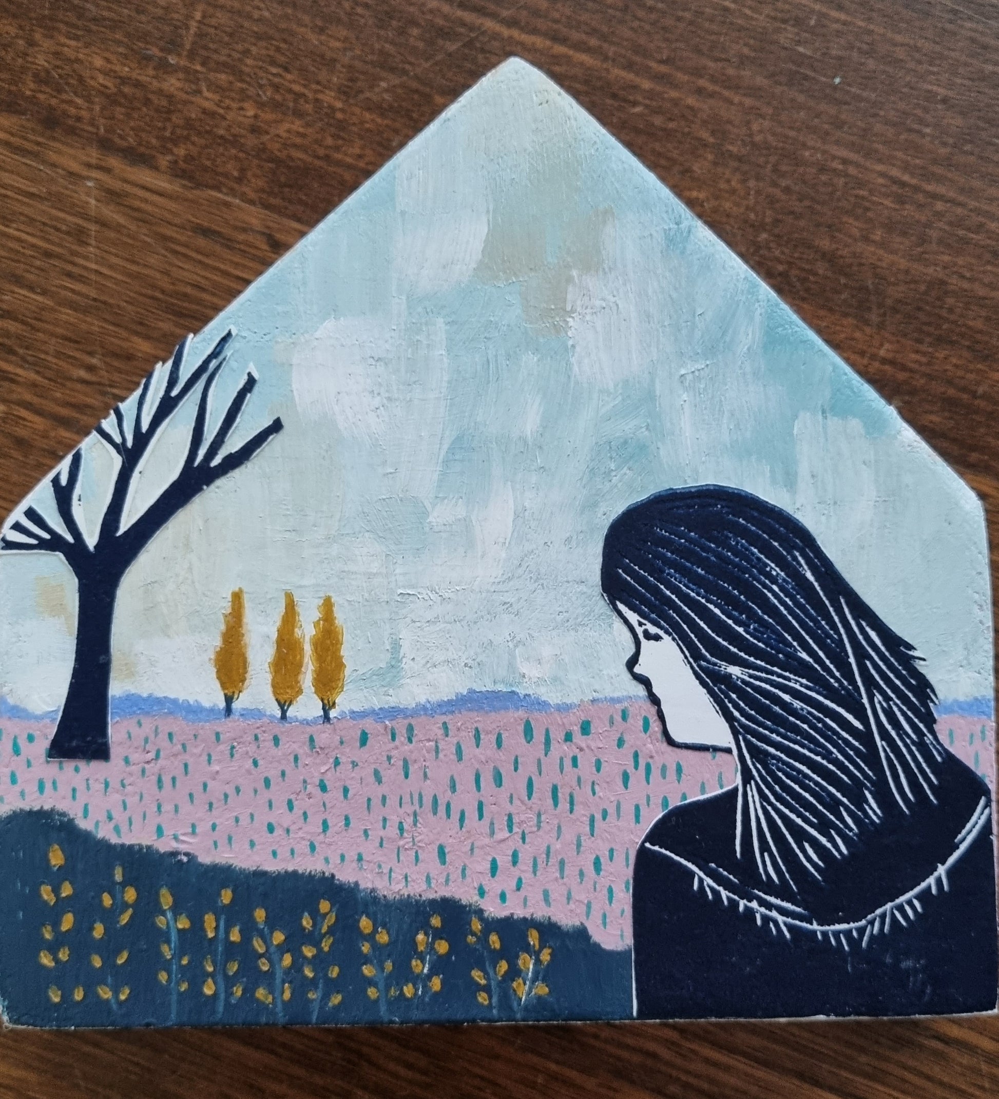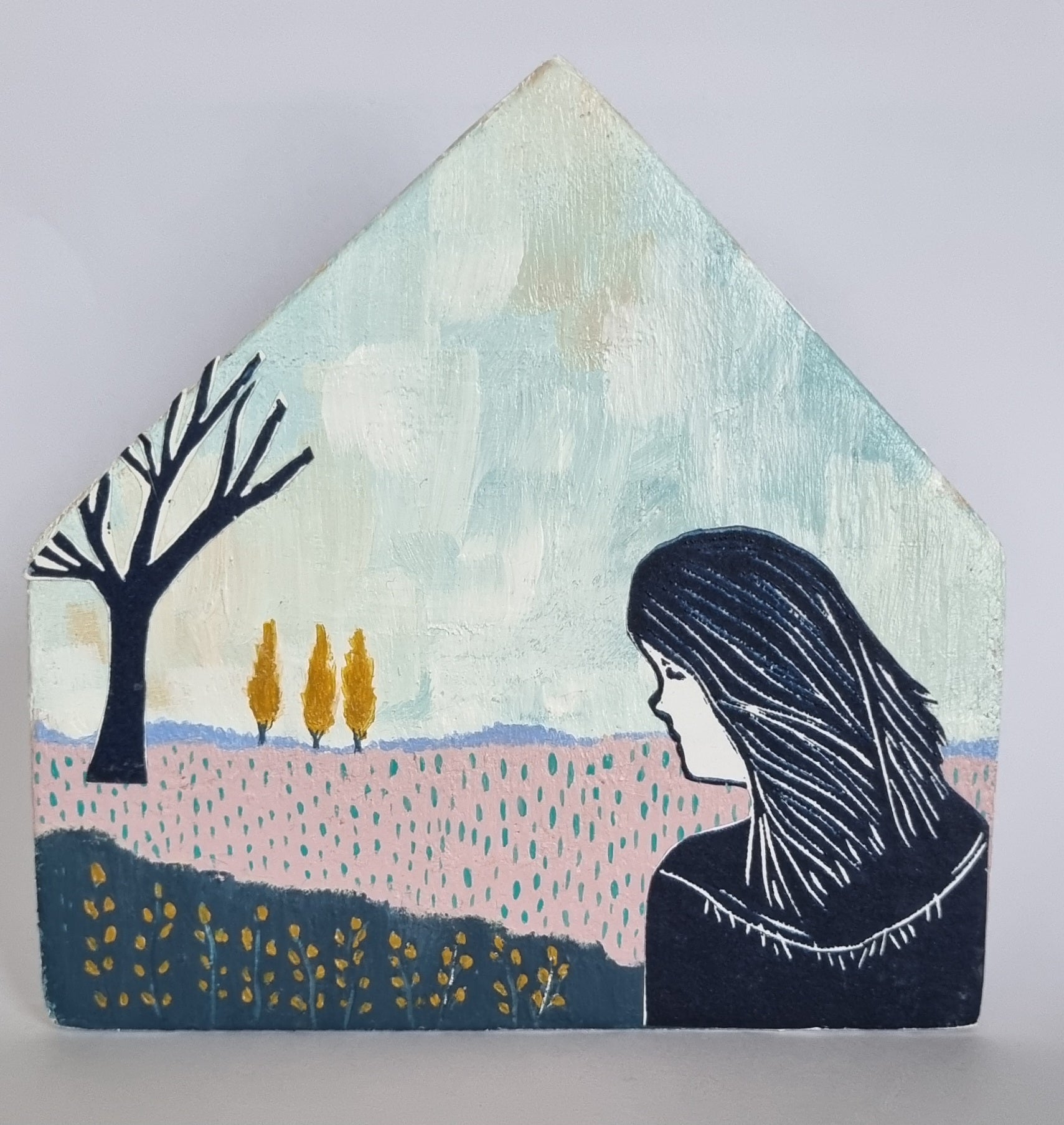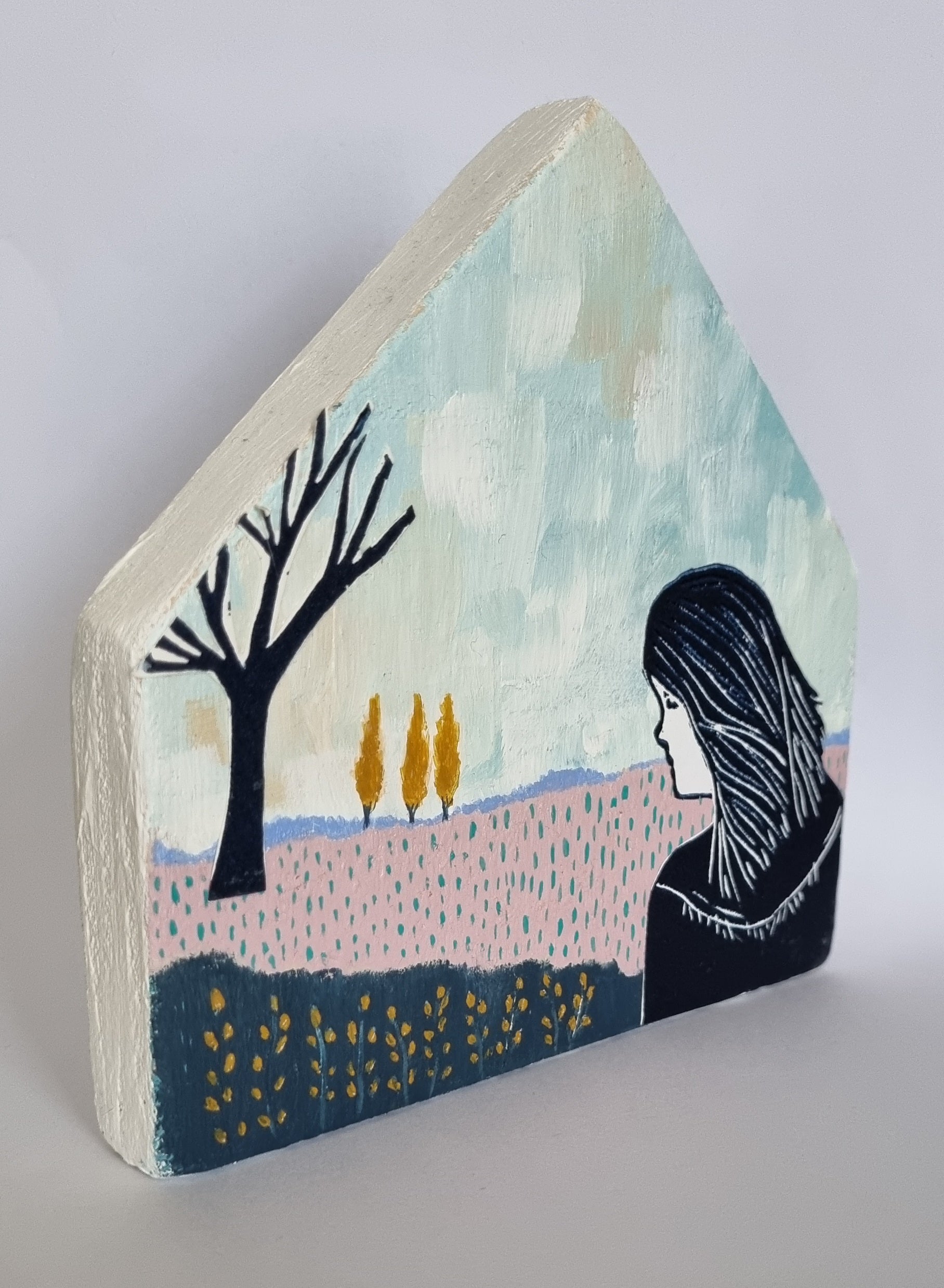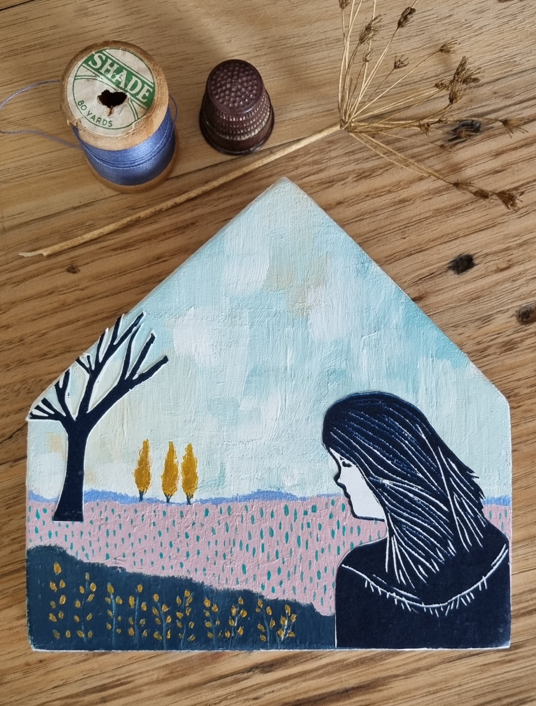 Over the Horizon is a mixed media timber sculpture. using reclaimed timber , its cut into a house shape, sanded. Then using acrylic paints I paint what my intuition tells me, a ideas comes. I also incorporate my original lino cuts and a collaged detail. It is approx 12cm X 12cm in size and can be hung on the wall with the D-ring that is on the back or can be placed upright freestanding. This sculpture is a complete one of its kind and will be sent in the padded bag via Australia Post.