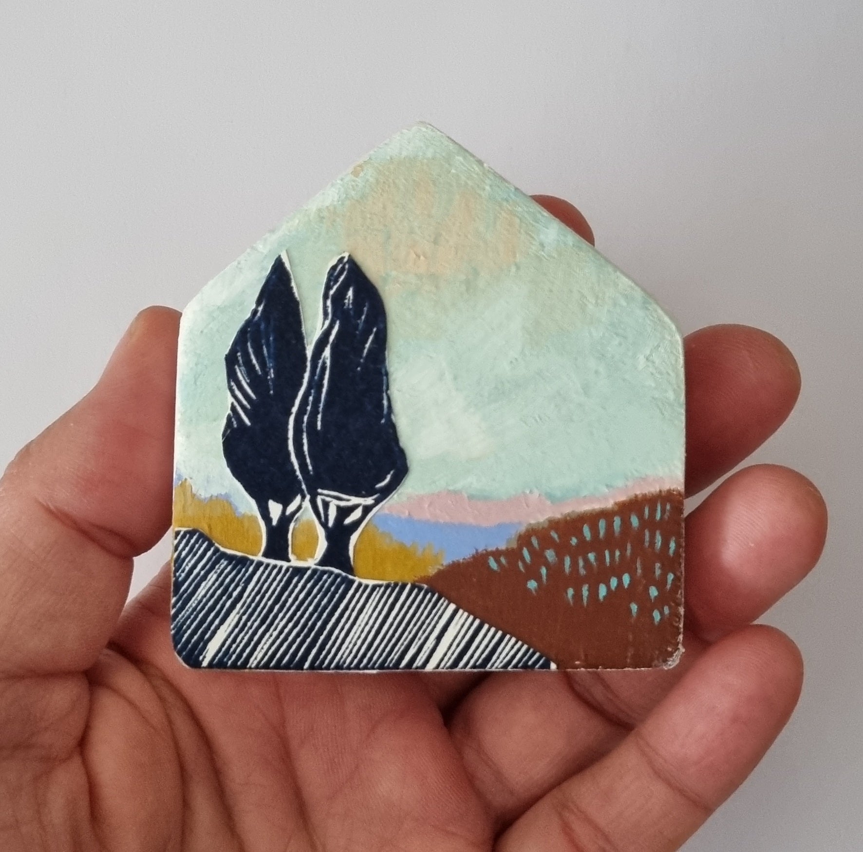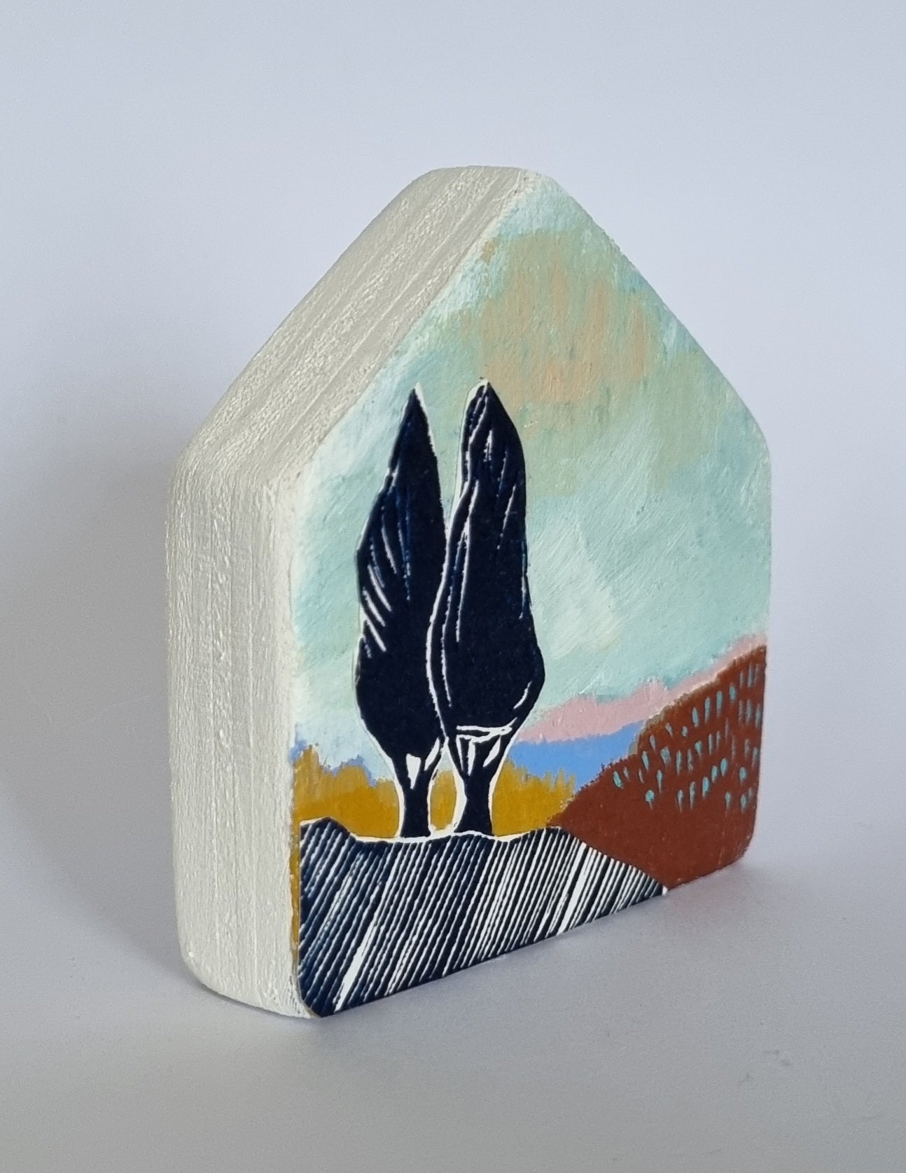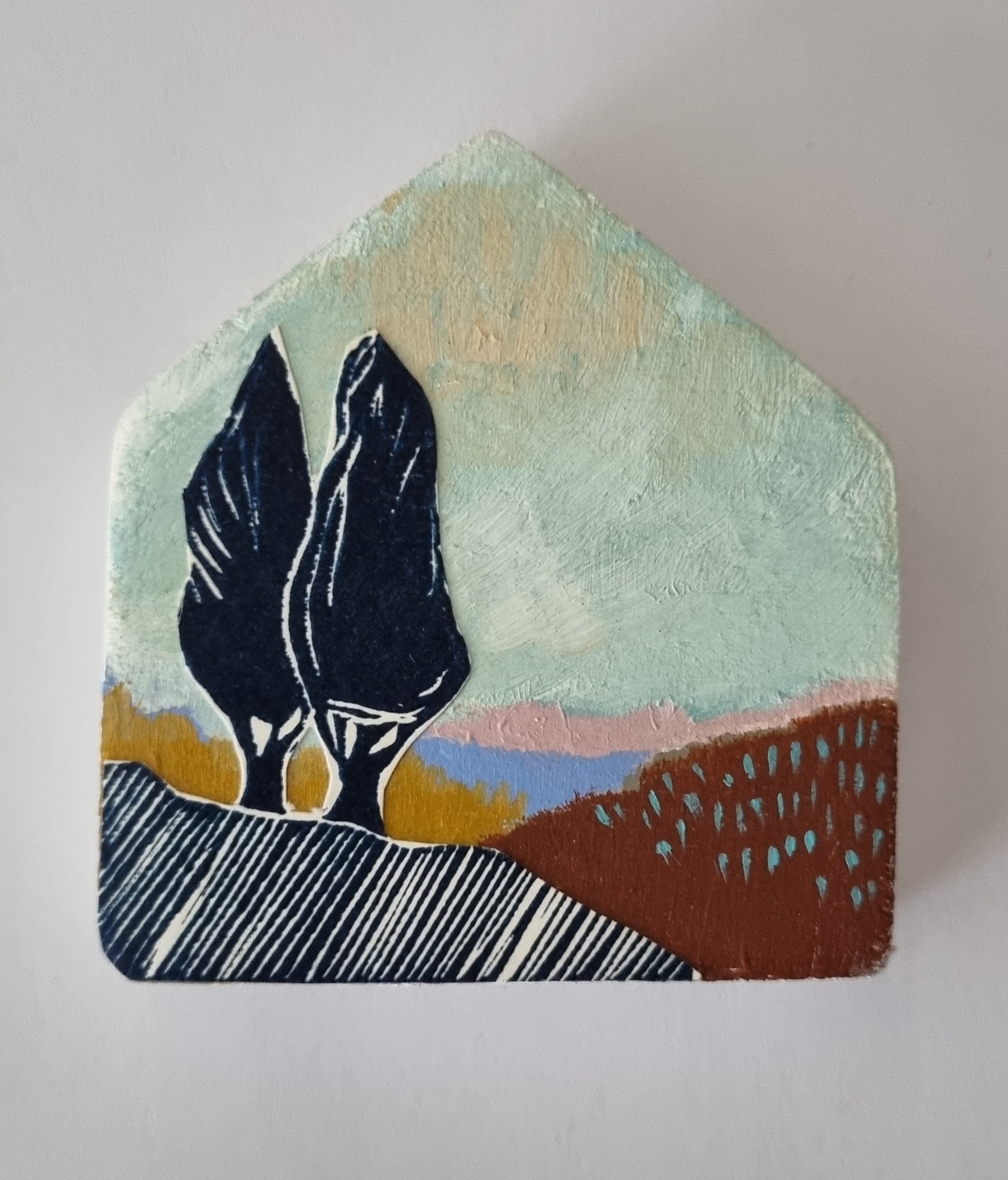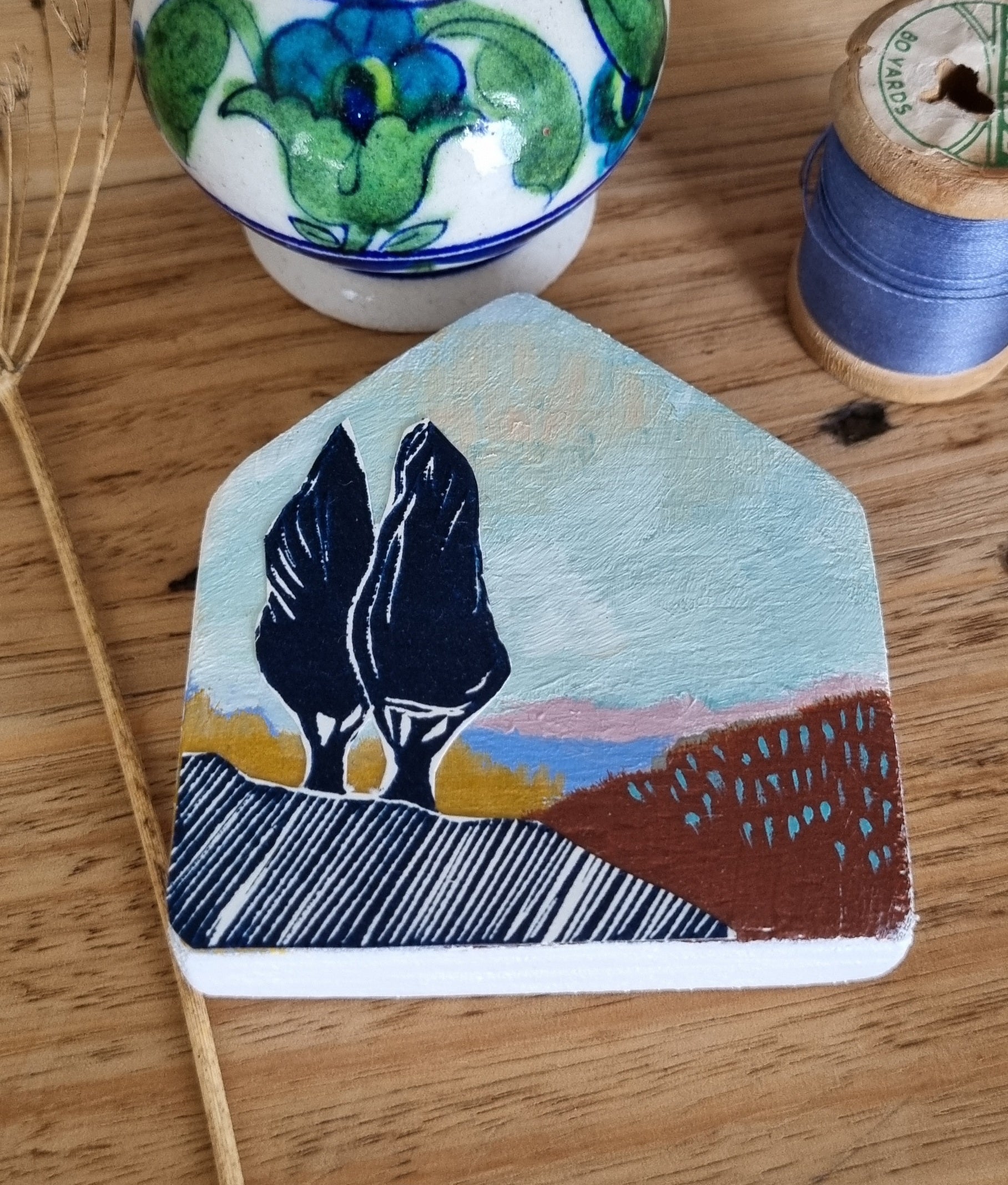 Poplar trees is a mixed media timber sculpture. It is created using hand cut reclaimed timber, sanded and painted with acrylic paints, it also has an original lino cut that is collaged then vanished. Its inspired by one of my favorite trees and is one of its kind. This beauty is 7cm X 7cm in size and can free stand.
