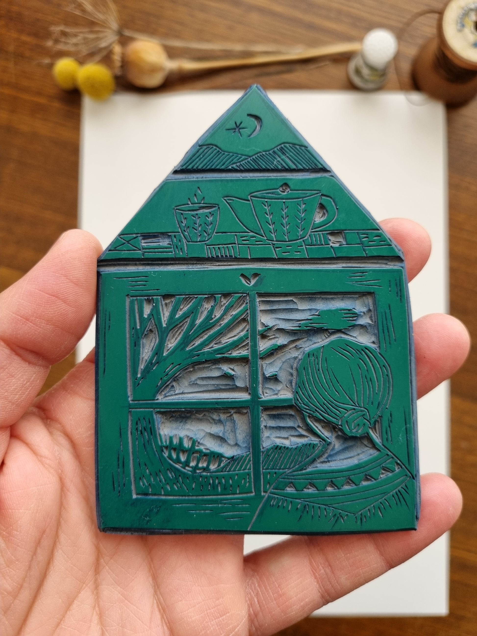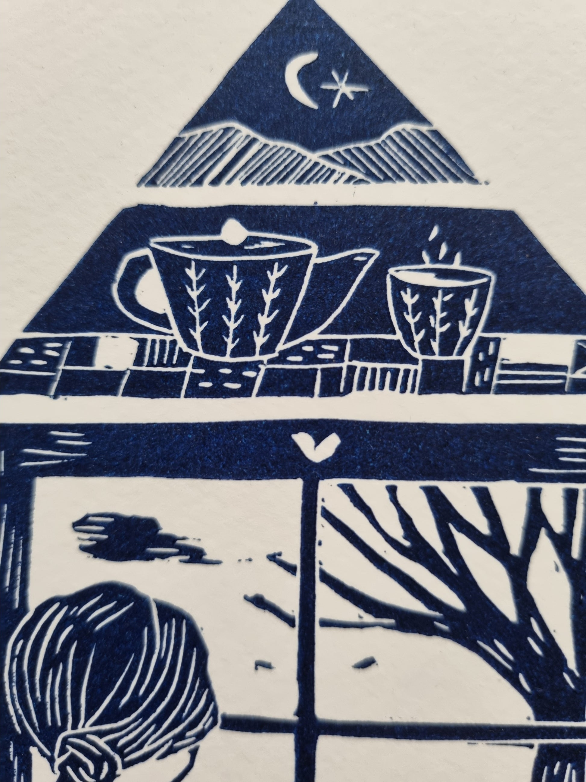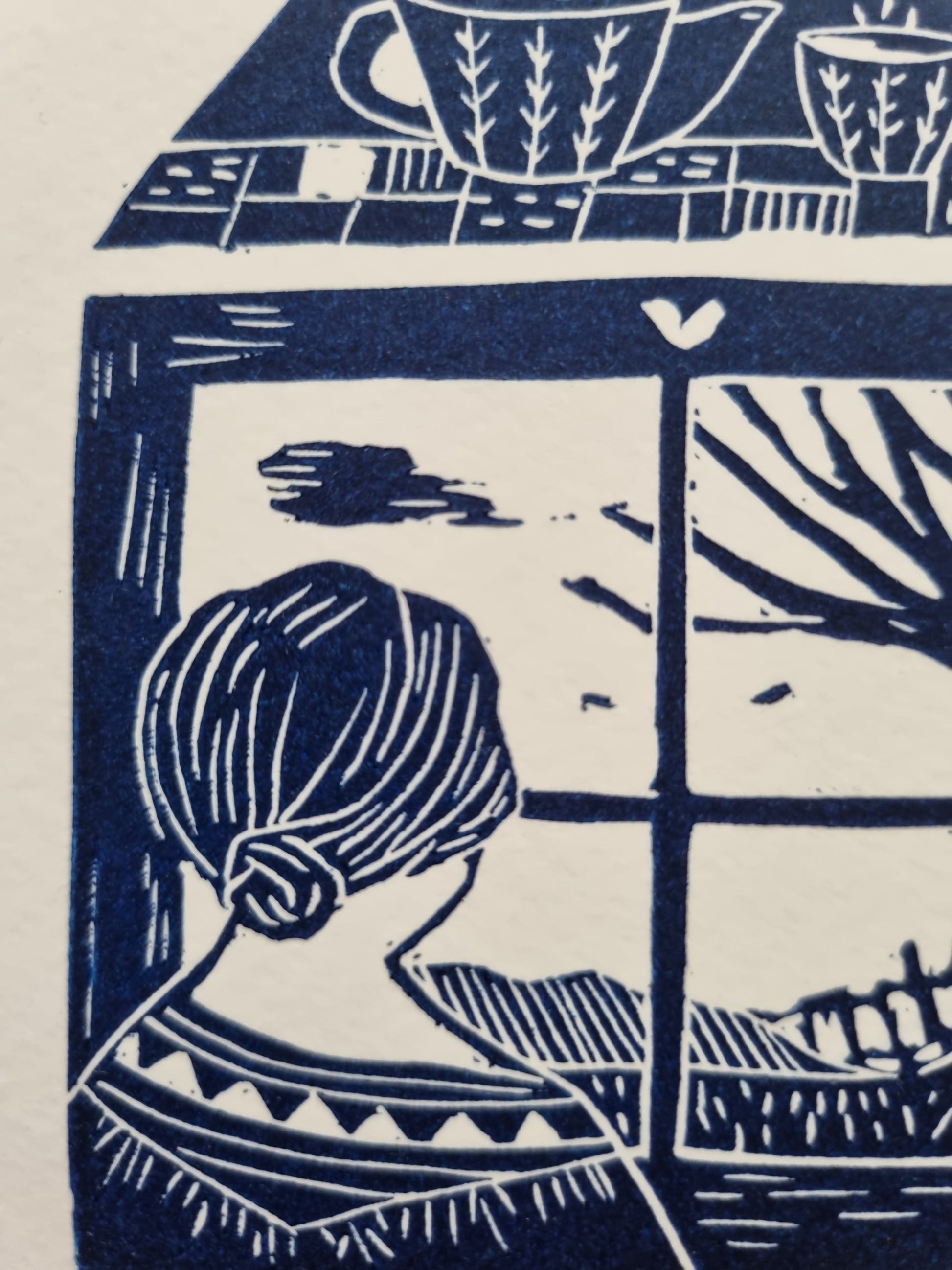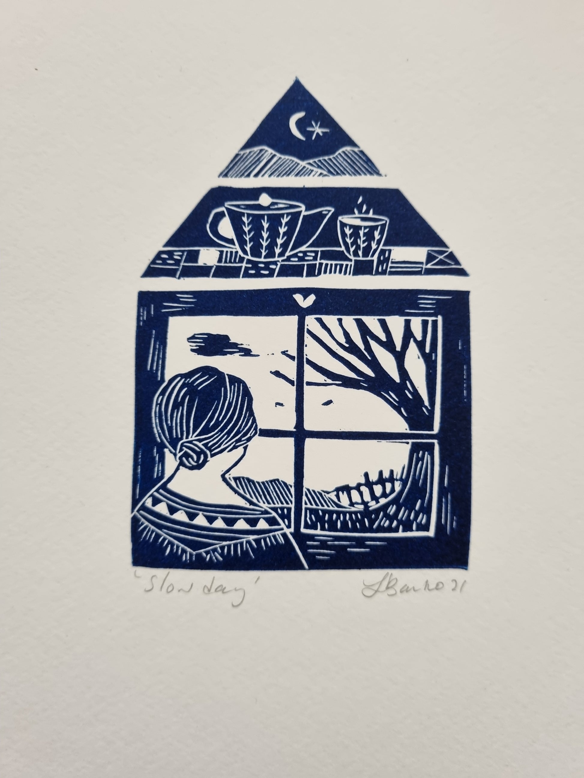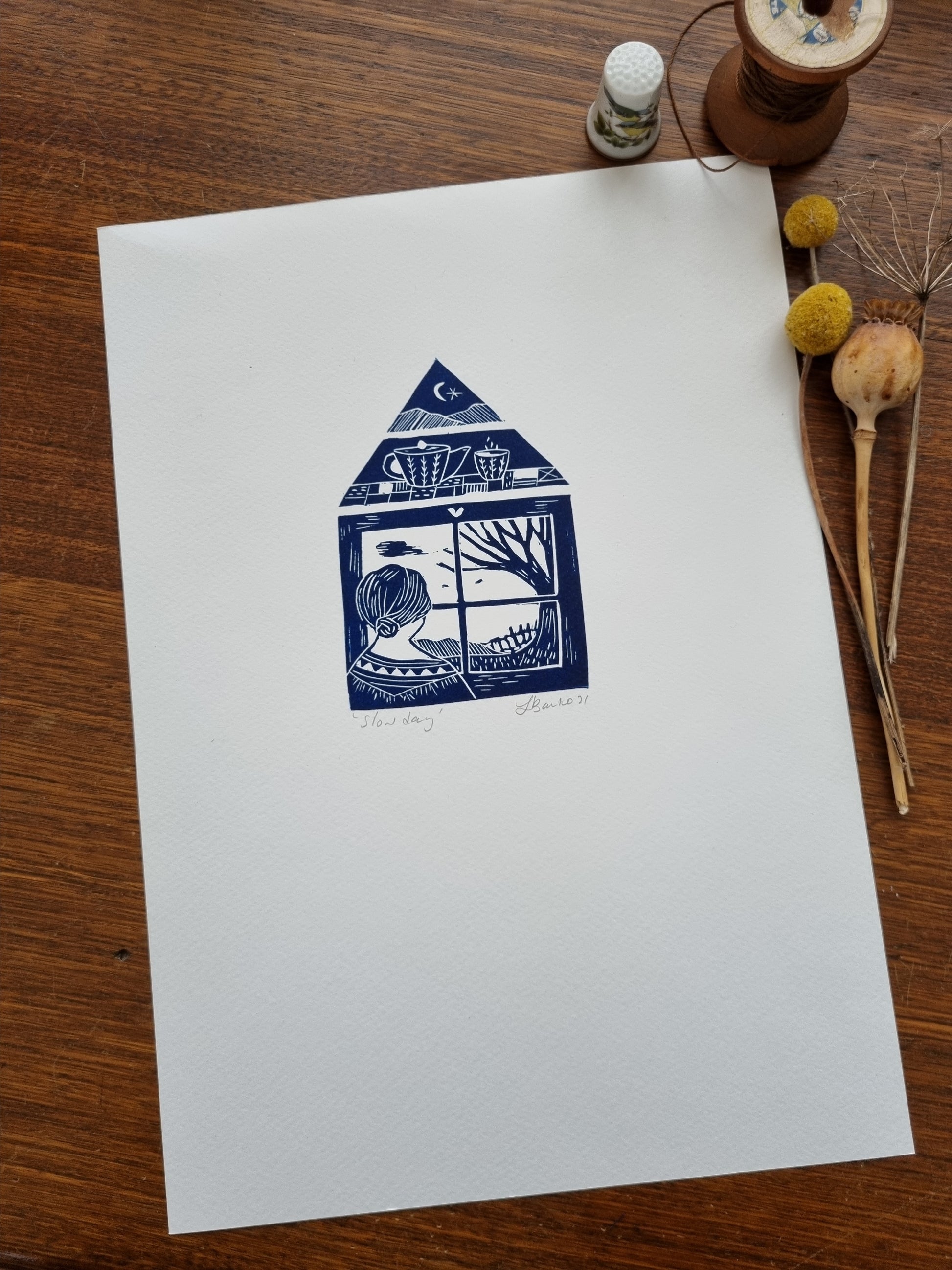 'Slow day' is a homage to slow living and taking pleasure in the little things. The quietness of the end of autumn. This is an original lino cut carved by me and printed through my printing press in my home studio.