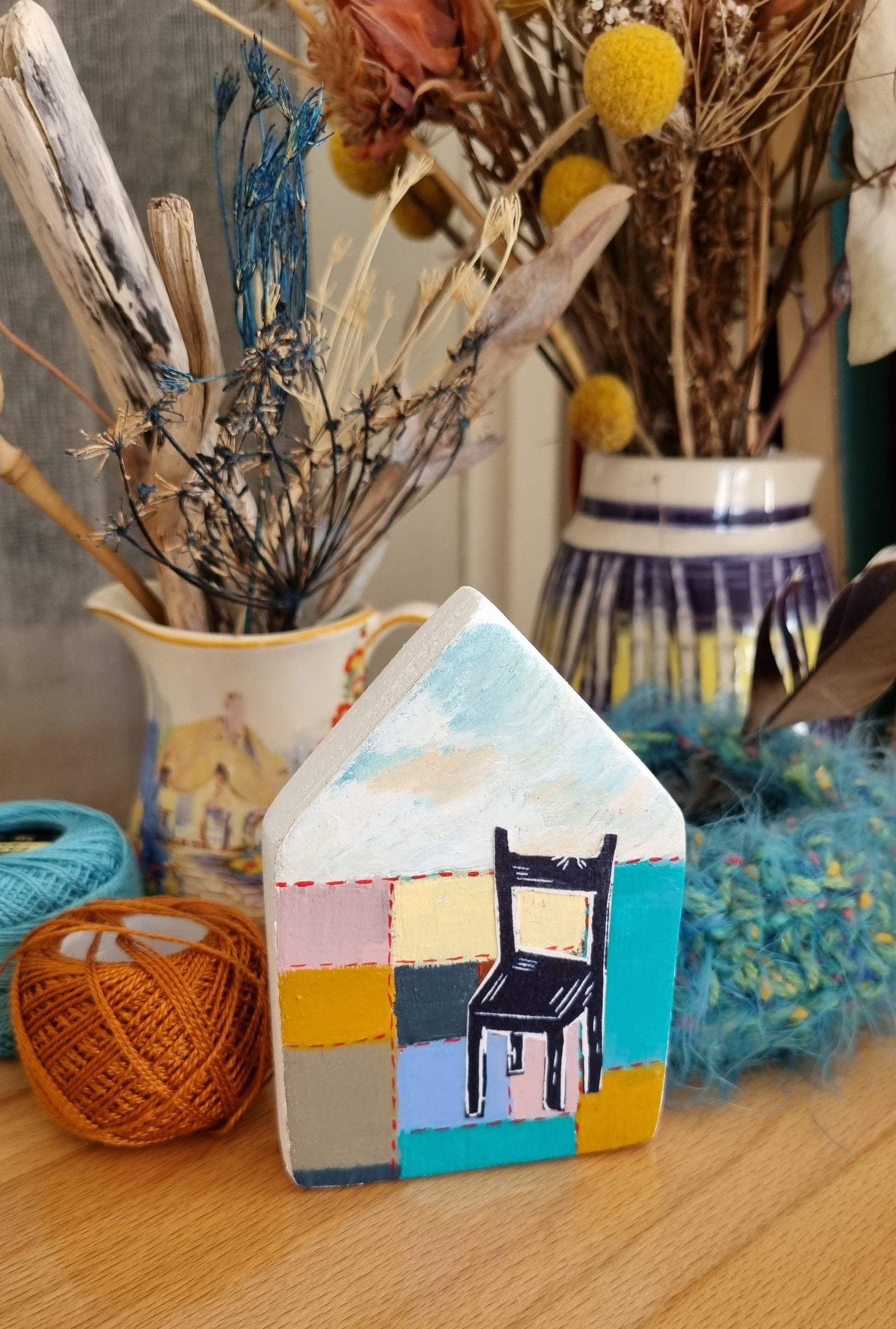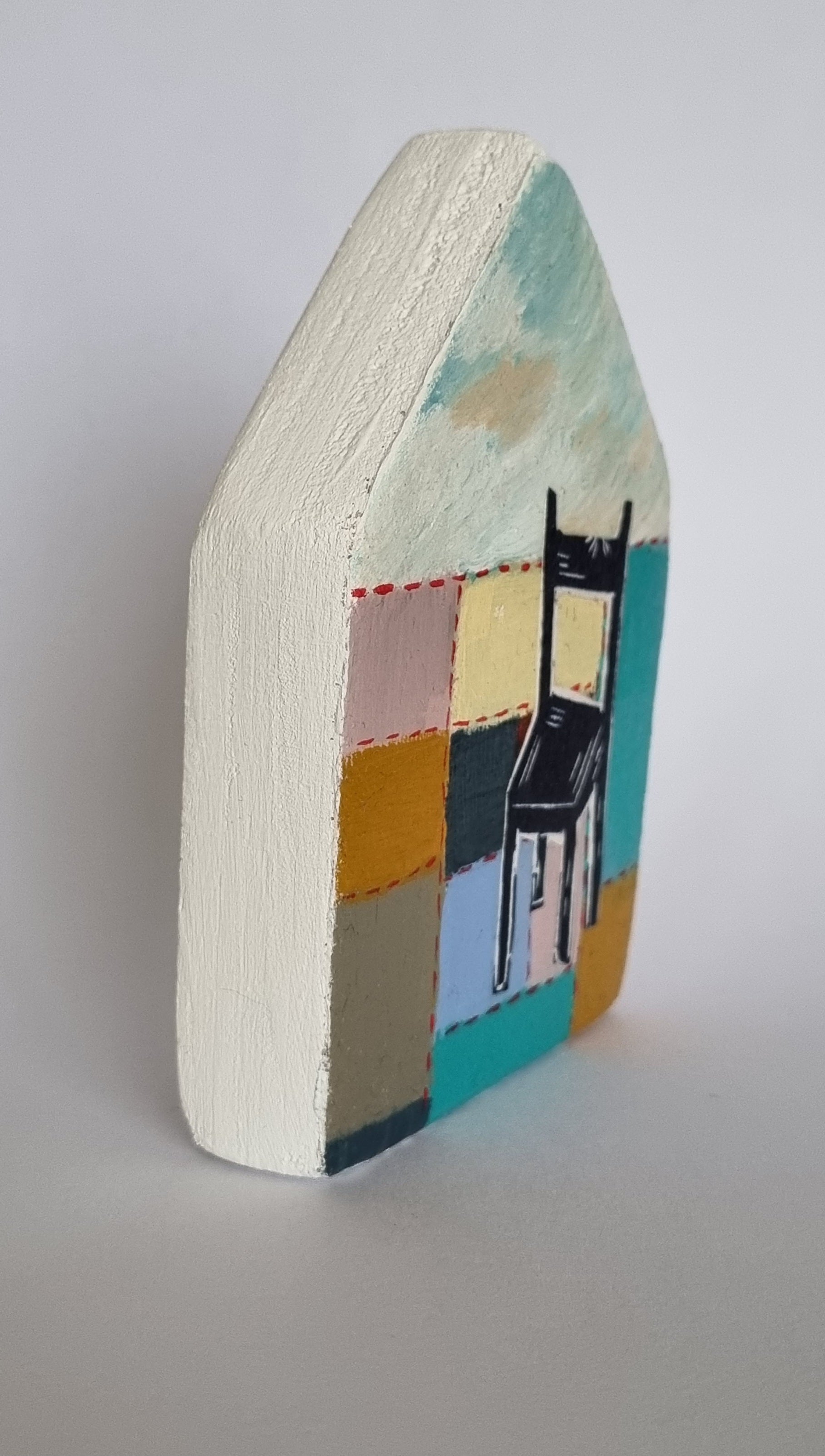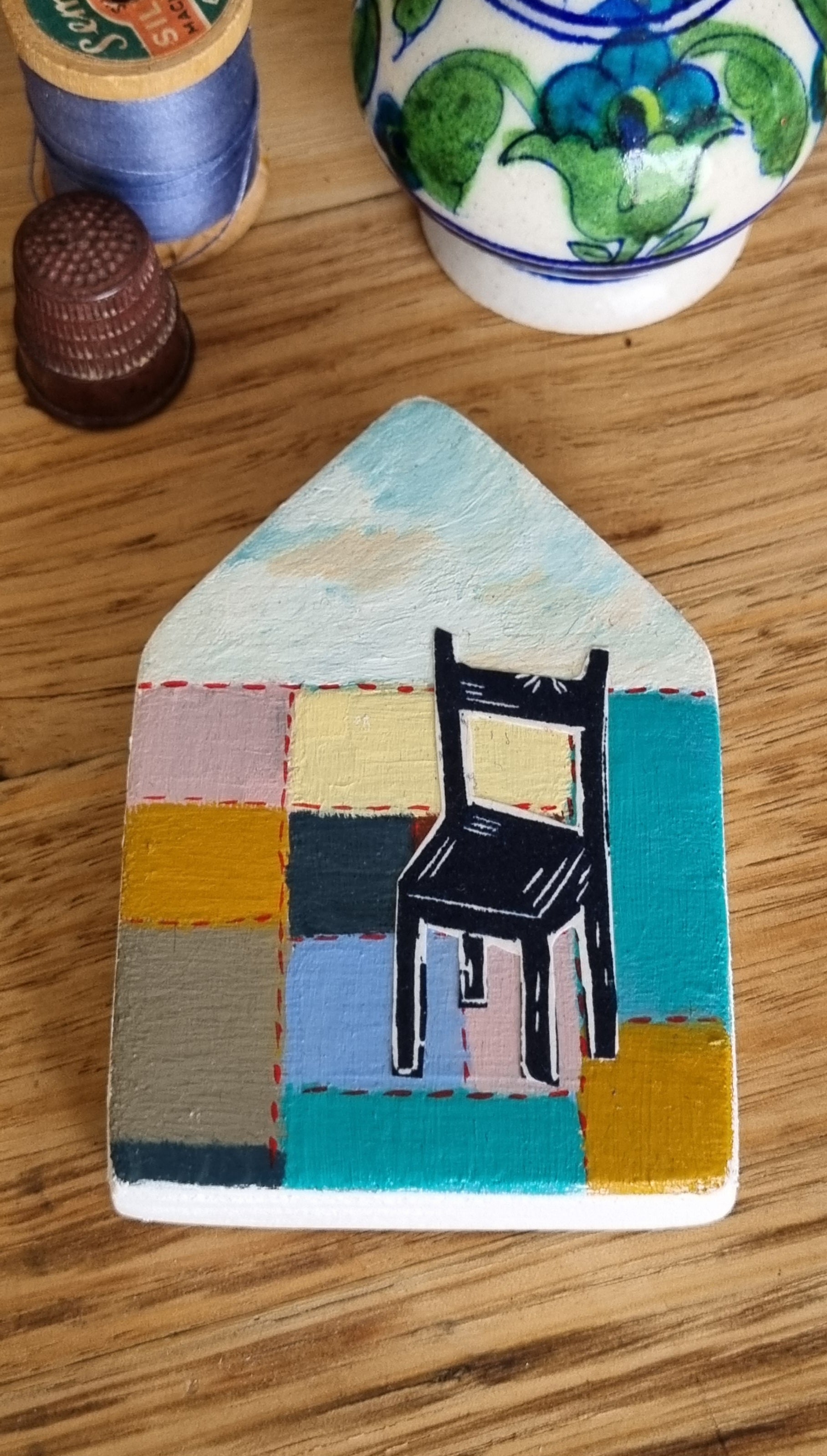 Tailors chair is a mixed media on timber sculpture. The reclaimed timber is cut and sanded by hand and painted with a rough idea in mind. The inspiration for this piece is from my grandfather who was a tailor. He had such an amazing workshop at his home where he would sew clothes for my nana and the family. It was a treasure trove of coloured threads, fabric, old sewing machines and him sitting in his chair. This piece is approx 6cm X 9cm in size and will be sent in a padded bag via Australia post.