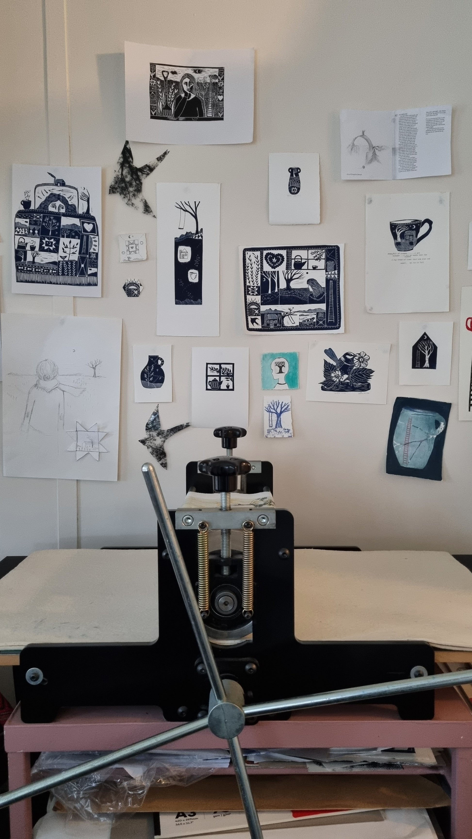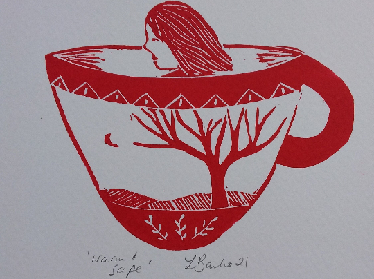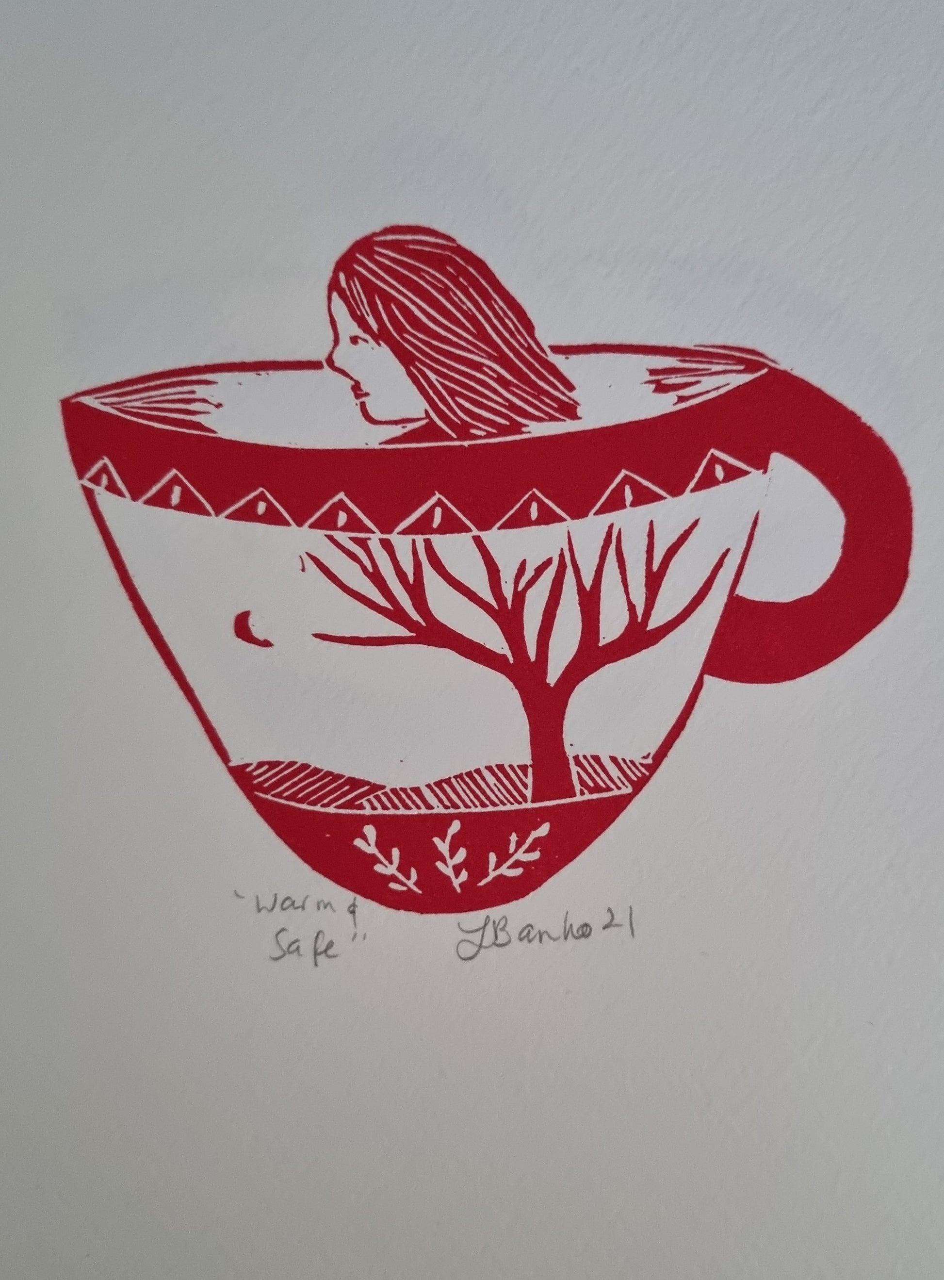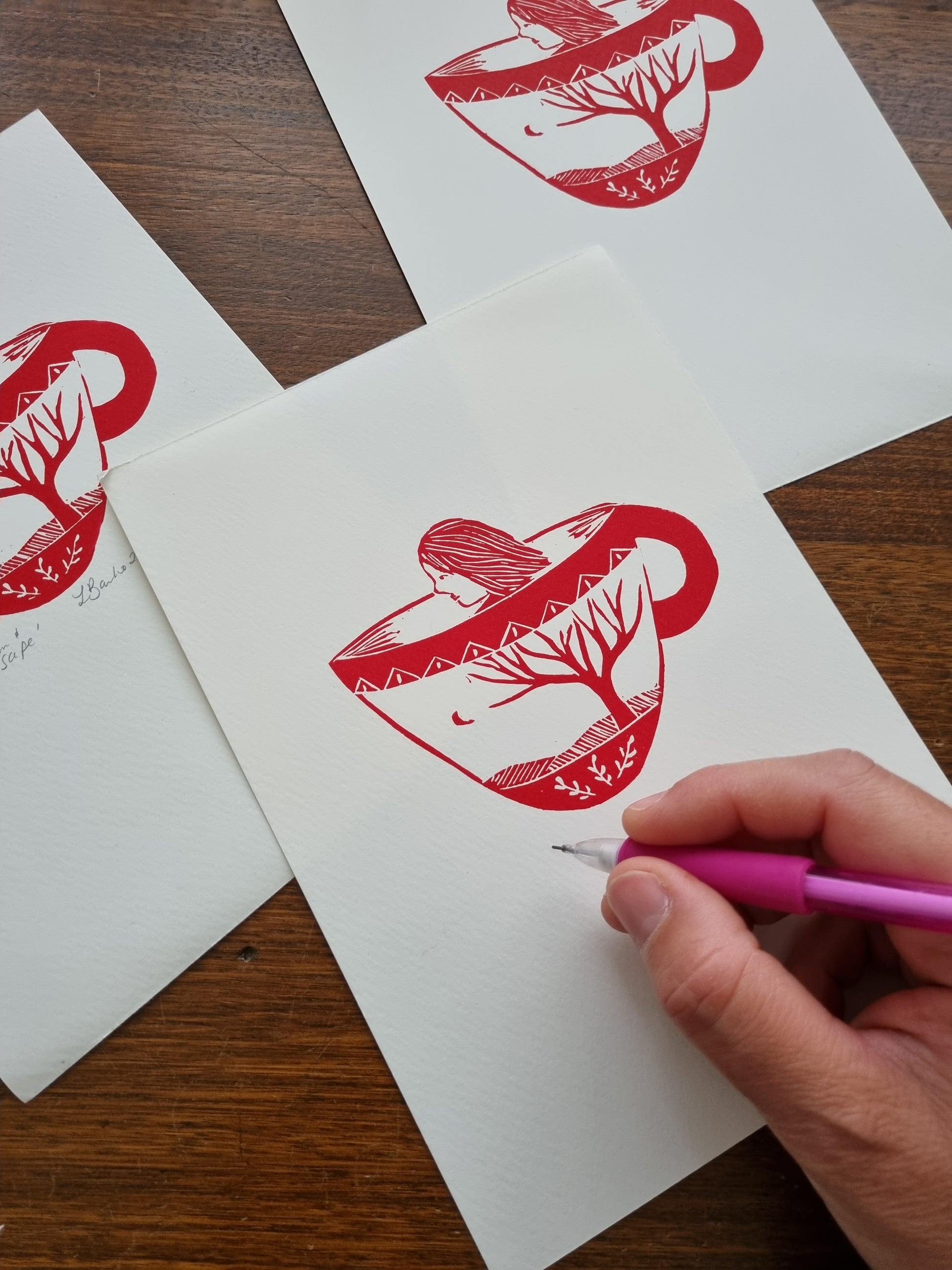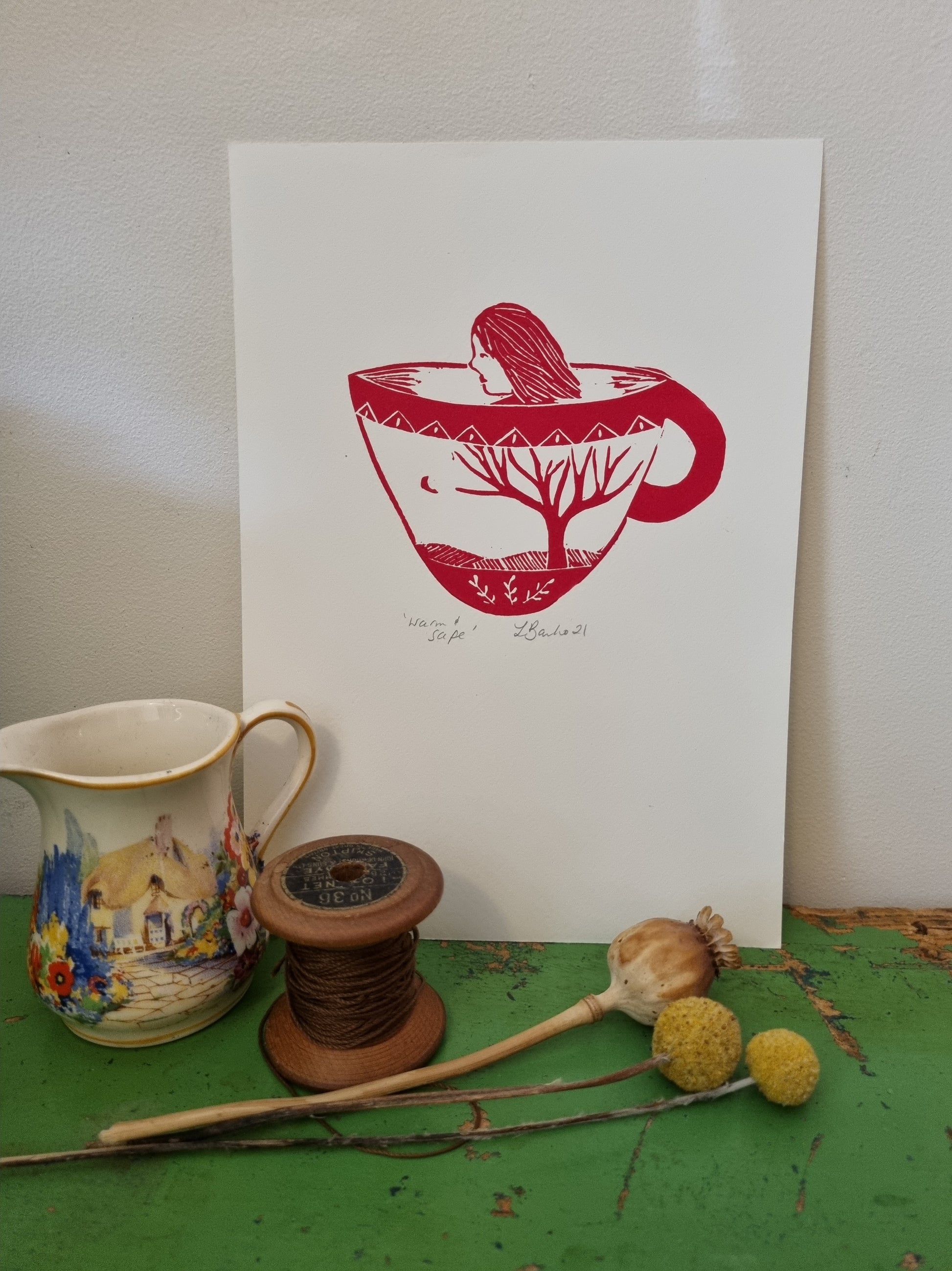 "Warm and safe" is an original lino cut. It was an idea that was swirling in my head for some time so I decided to carve it into lino...I love my daily ritual of making tea and some days I feel like I could hide away in a cup.... it's printed by hand using my printing press in my humble little home studio. It's printed in red oil based ink on A5 180gm watercolour paper ready to be enjoyed. This is an open edition signed,dated and unframed . It is packaged in a clear protective sleeve and sent in a rigid flat envelope via Australia post.
