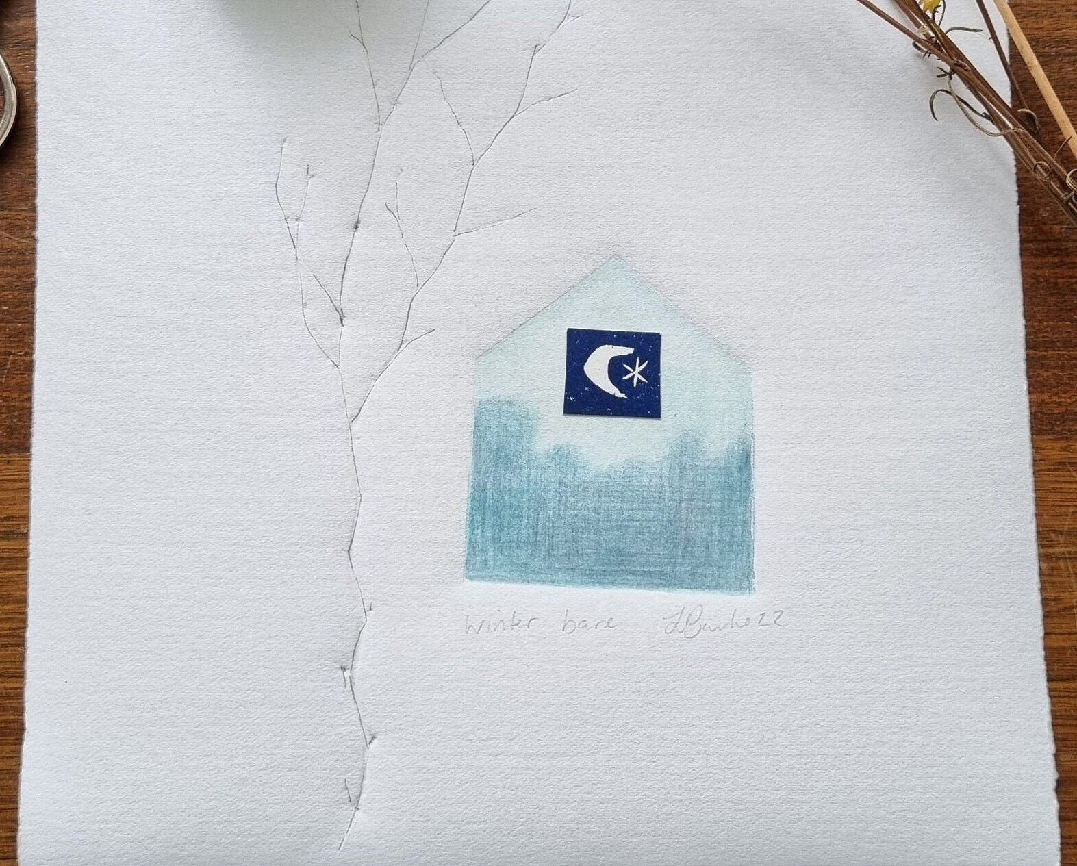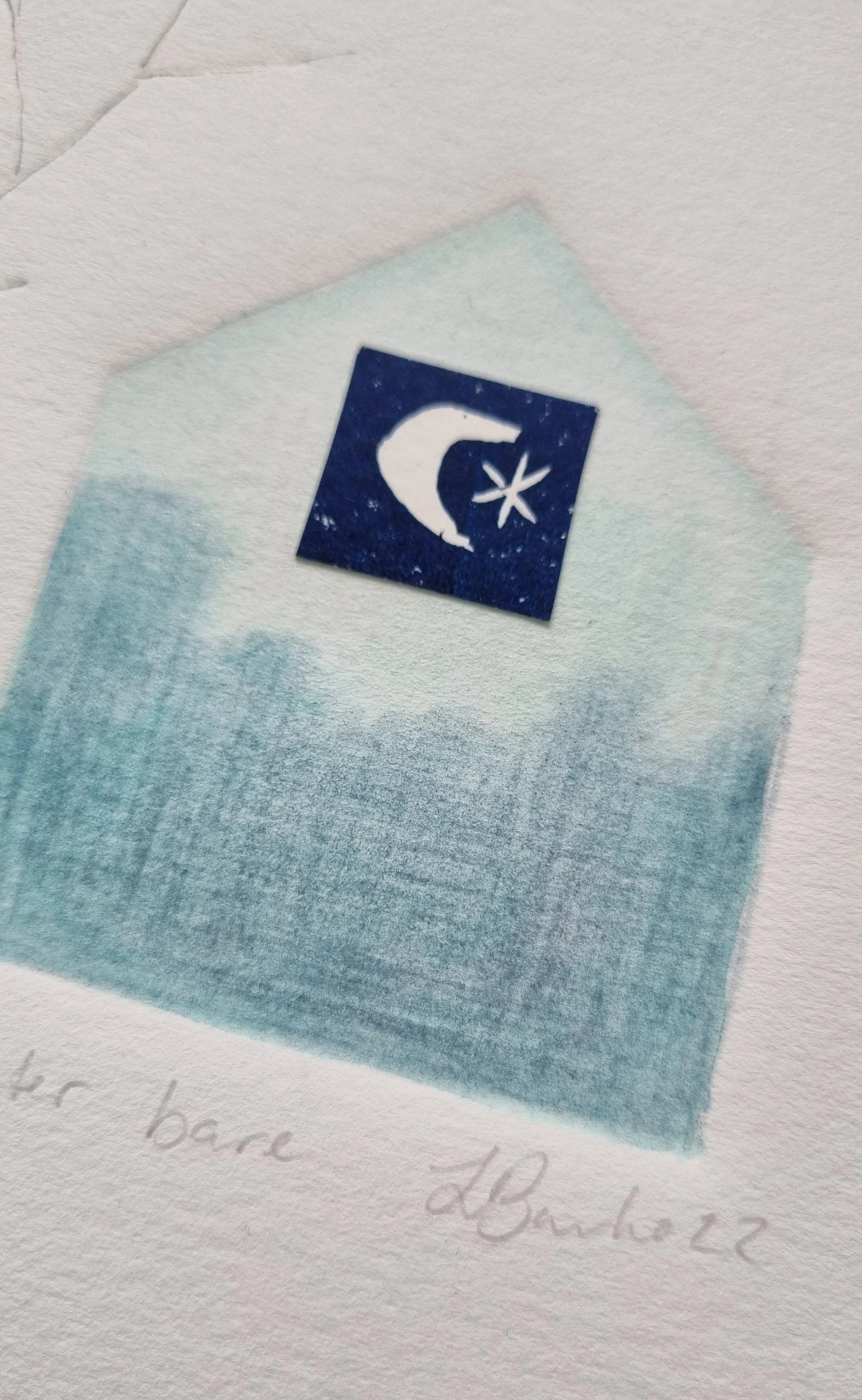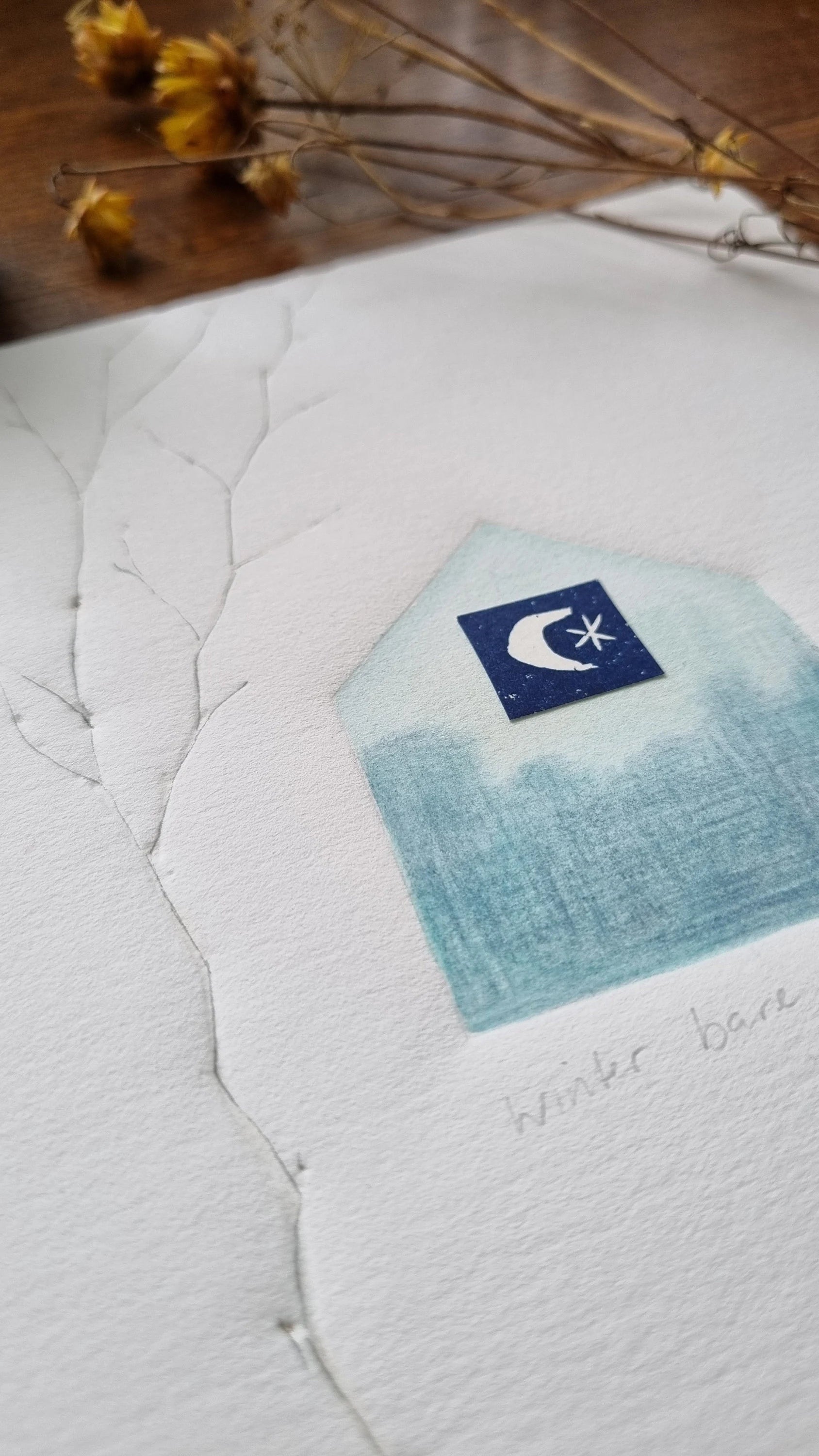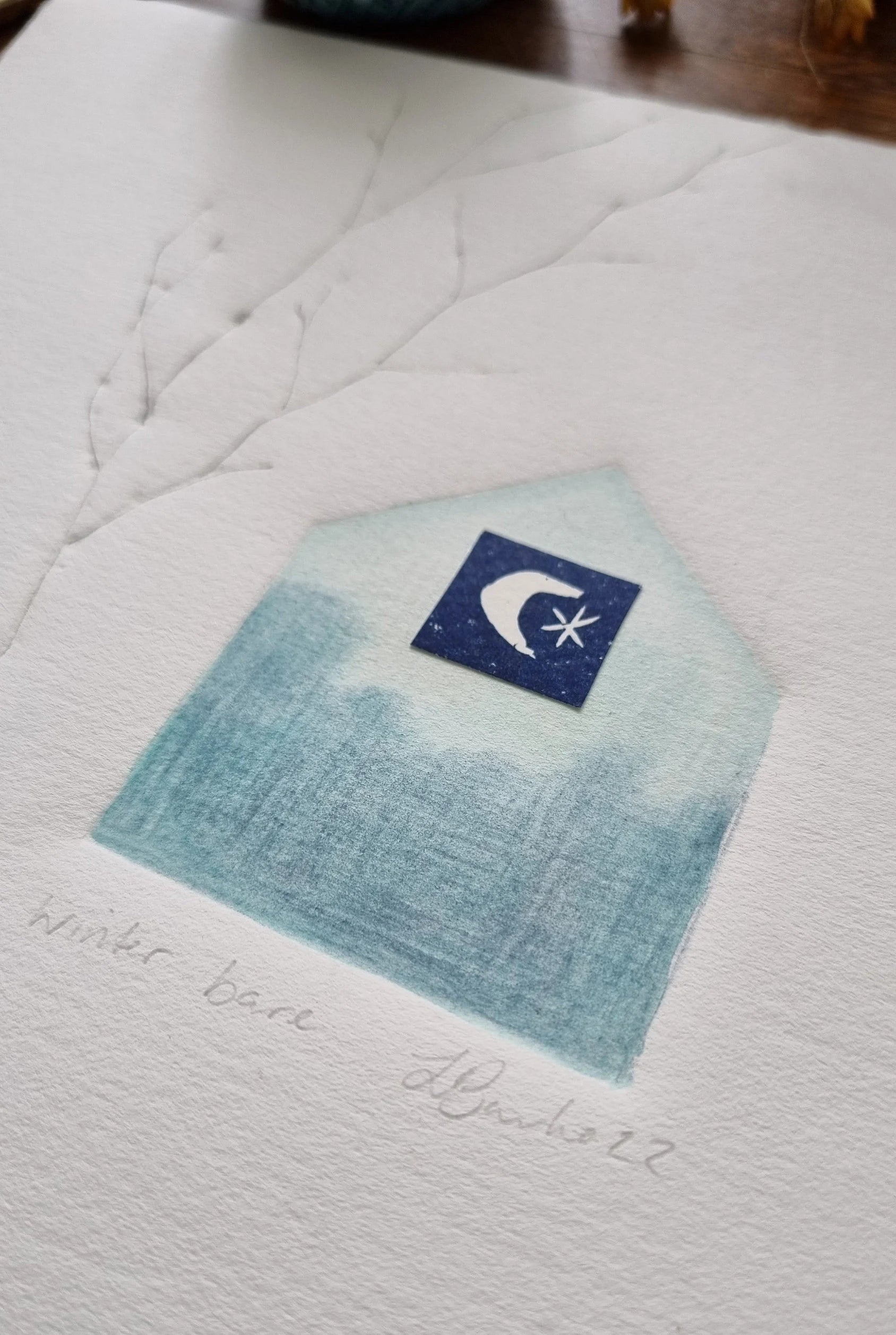 Winter bare is a one of its kind original signed artwork. This was created by embossing leaves and a house shape into Fabriano 220gm rosapina paper, through my printing press. The size is 18.5cm X 18cm ......I also used watercolour, pencil and one of my original lino cut collaged to make this mixed media work on paper. This piece will be sent in a protective sleeve in a rigid mailer via Australia post