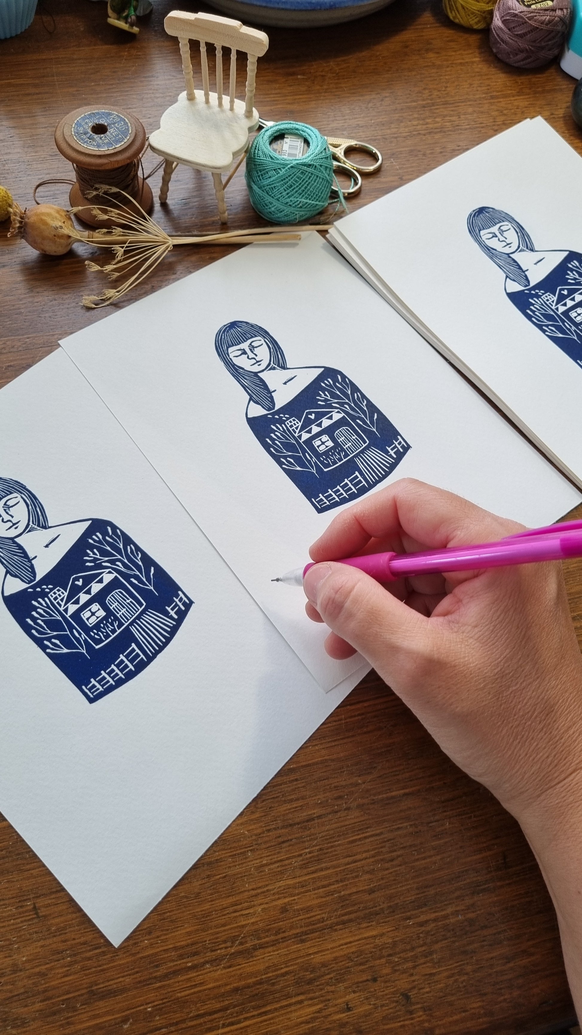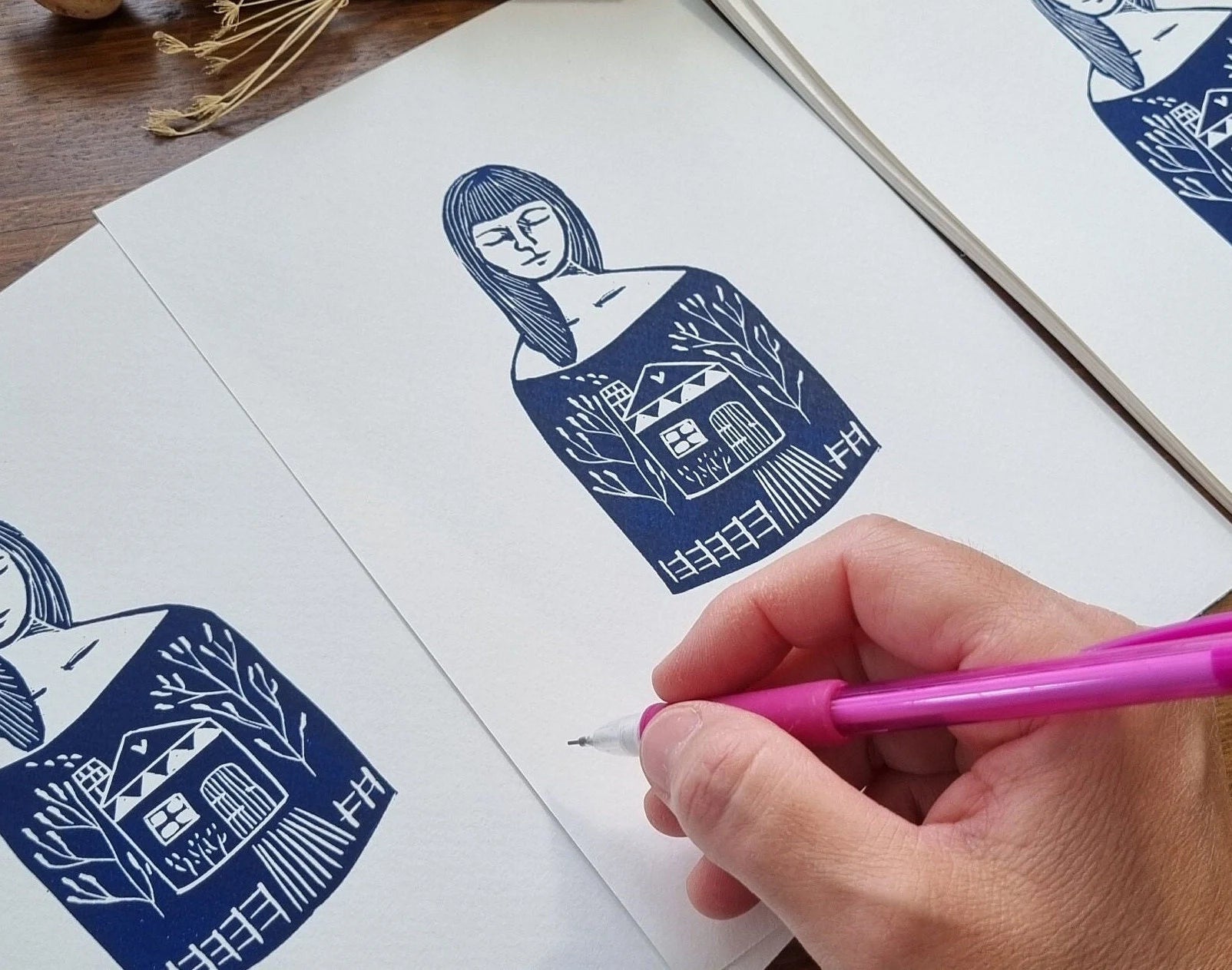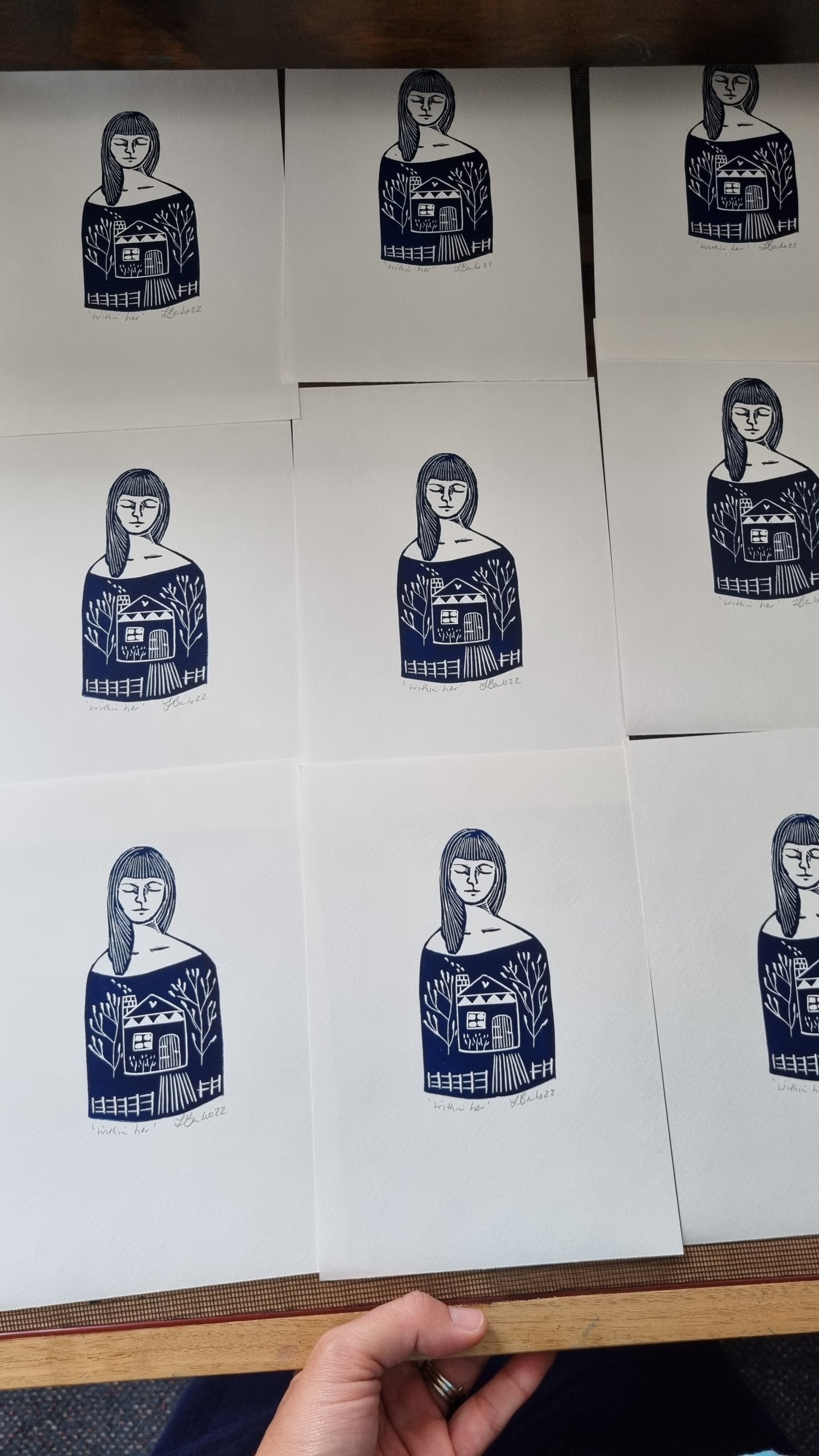 Within her is a original hand carved lino cut. It is from an original drawing inspired by all the dreams and hopes one can carry in a lifetime. It is printed through my etching press in my home studio. It is dark blue oil based ink on A5 watercolour 180gm paper, dated signed and unframed. It is packaged in a clear protective sleeve wrapped and sent via a rigid mailer via Australia post.
